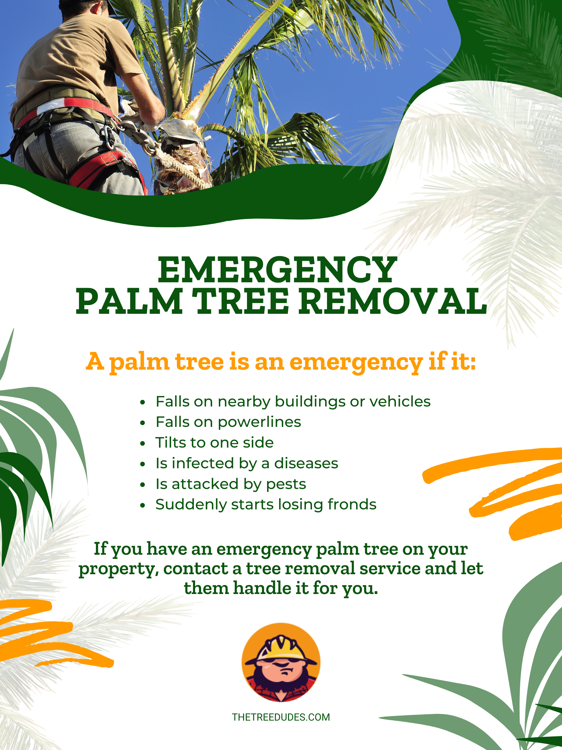 Pero a pesar de sus beneficios, las palmeras también pueden convertirse en emergencias que amenazan su seguridad y presupuesto. No sólo pueden perjudicar su bienestar físico, al caerse o perdiendo ramas grandes, pero también pueden causar muchos daños a la propiedad. Si caen sobre el techo, el automóvil, el porche o el cobertizo, pueden dañar y destruir fácilmente cualquier cosa que se interponga en su camino. También pueden caer sobre líneas eléctricas y cortar el suministro eléctrico en toda la zona.