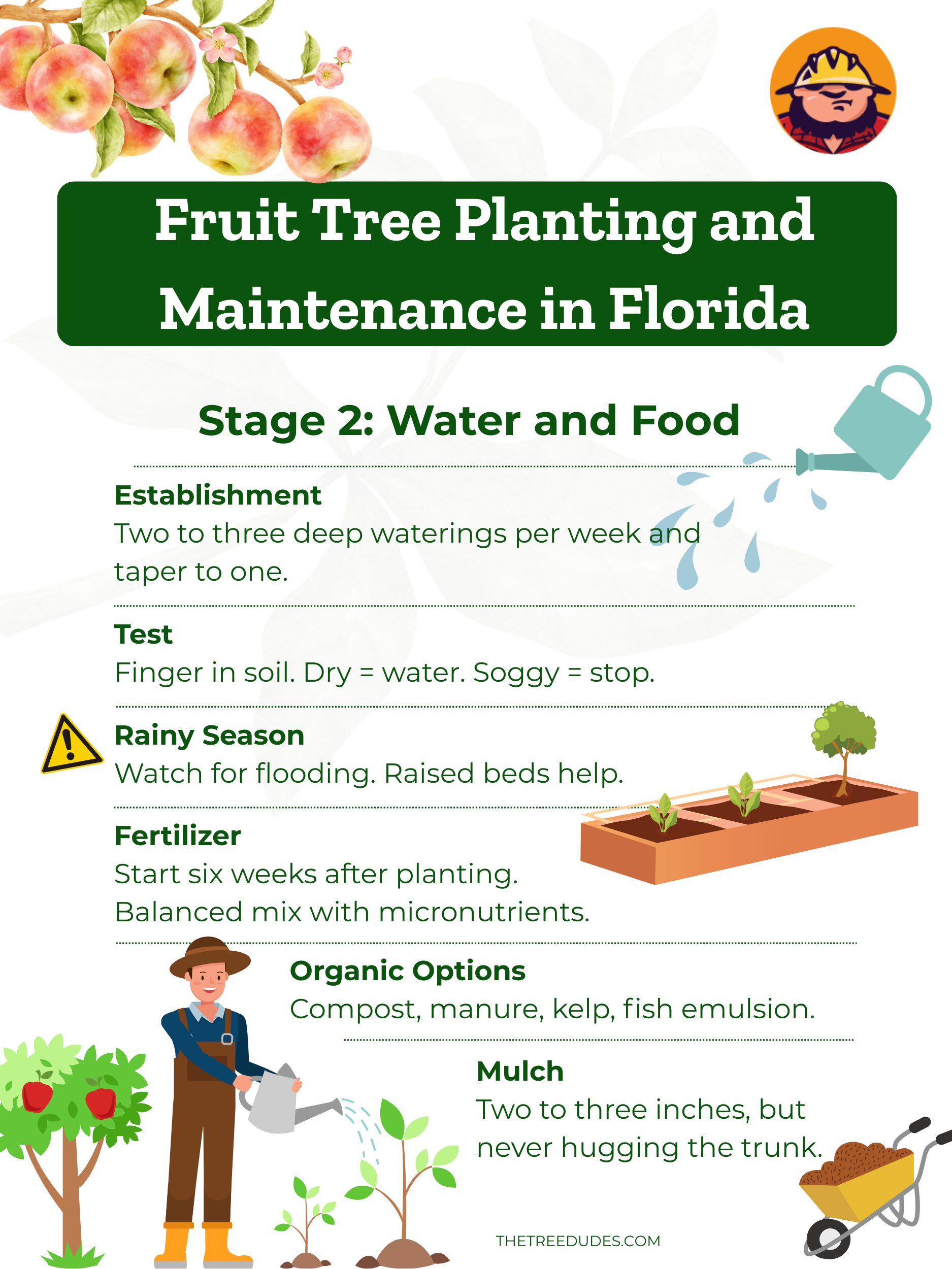 Tras plantar, su árbol frutal entra en su fase crítica de establecimiento. El riego es la tarea más importante durante las primeras semanas. Procure mantener la zona radicular constantemente húmeda, pero no encharcada. Con el calor de Florida, esto podría significar regar profundamente un árbol recién plantado de 2 a 3 veces por semana durante los primeros meses, y luego puede reducir la frecuencia a una vez por semana, dependiendo de la lluvia.