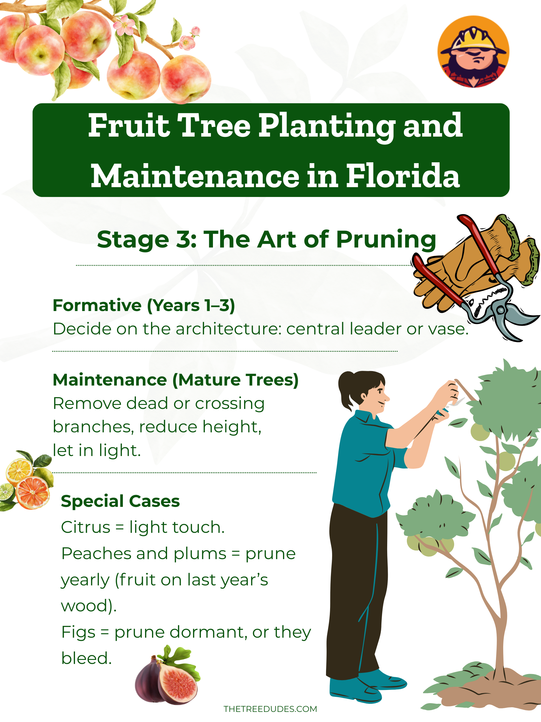Un aspecto muy importante del mantenimiento es la poda. La forma y el momento de la poda influirán en la forma, la salud y la productividad del árbol. Para la mayoría de los árboles frutales en Florida: