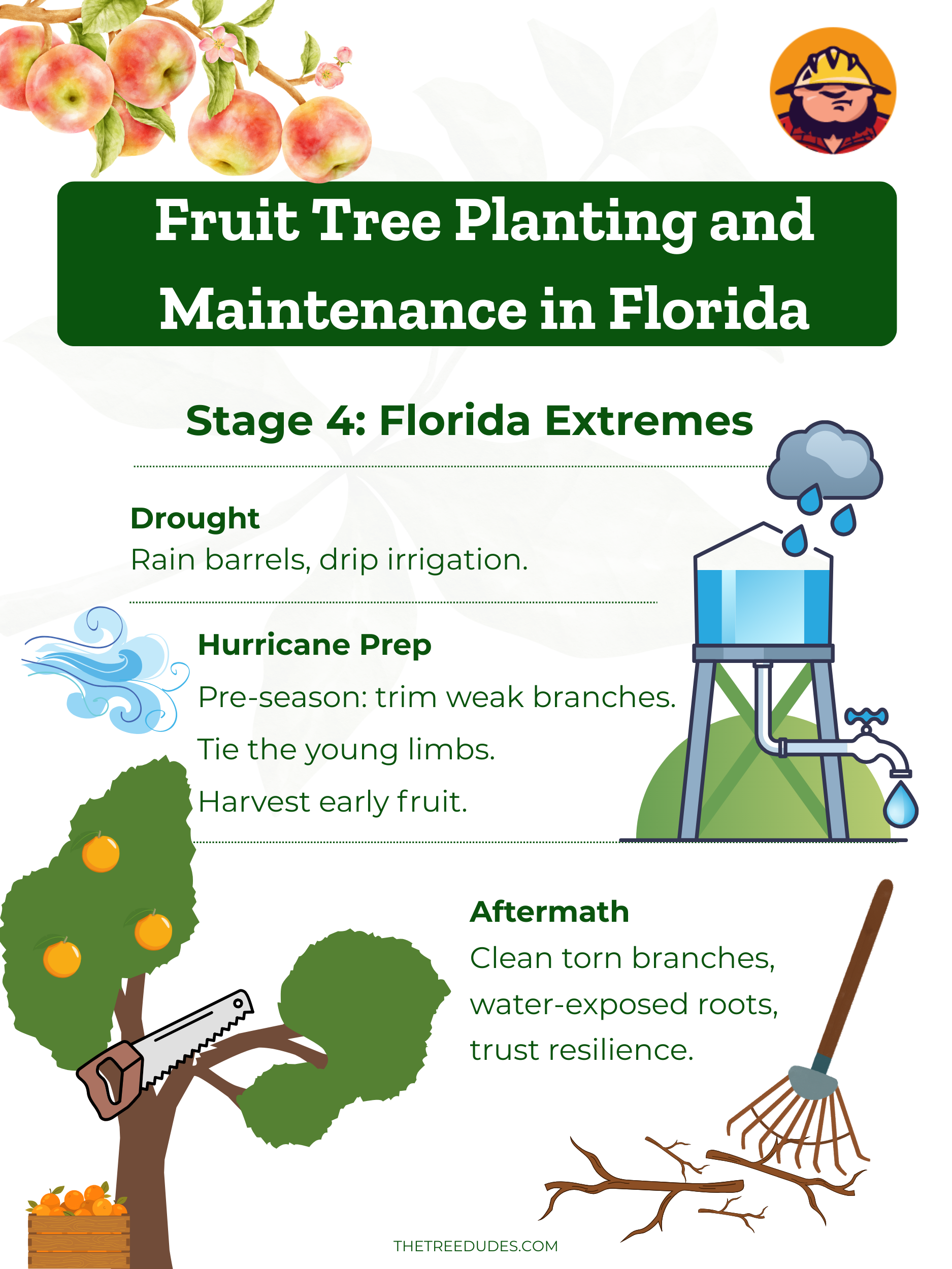 El clima de Florida puede variar de sequía a lluvias torrenciales, de calma a huracanes. En caso de sequía, considere un barril de lluvia o un sistema de riego para mantener los árboles regados durante las restricciones de agua. En caso de huracanes o tormentas tropicales, un poco de preparación es muy útil: pode las ramas muertas o débiles con antelación. Idealmente, mucho antes de la temporada de tormentas, ya que no se recomienda una poda intensa justo antes de una tormenta, asegure las estacas nuevas y, si es posible, incluso puede cosechar los frutos maduros un poco antes para que no se conviertan en proyectiles con los fuertes vientos.