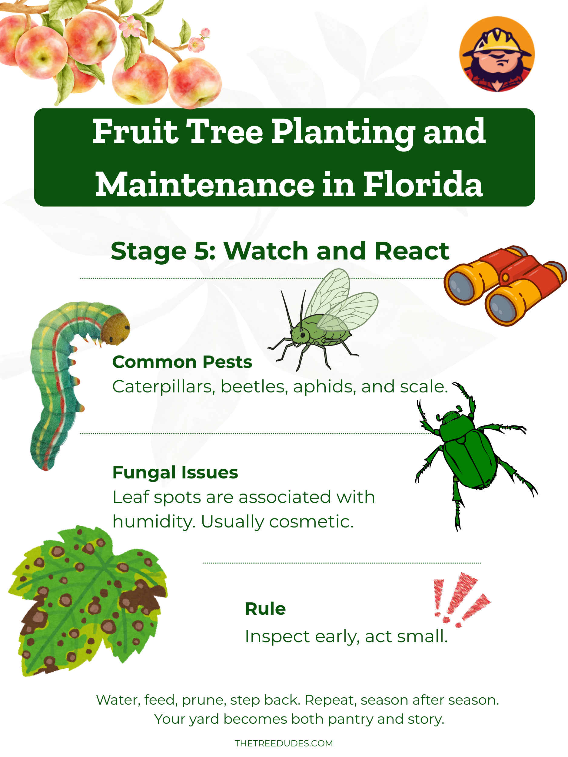 Además del agua y el alimento, vigile las plagas y enfermedades. Los árboles frutales jóvenes son especialmente vulnerables, así que detecte los problemas a tiempo. Cosas comunes a tener en cuenta en Florida: orugas o escarabajos que roen las hojas. La mayoría de los árboles toleran algo de mordisqueo, pero si la defoliación se agrava, puede intervenir con aerosoles orgánicos como Bt o spinosad. Las cochinillas y los pulgones pueden eliminarse con agua o controlarse con aceite hortícola o jabón. Simplemente evite rociar durante el calor del mediodía para evitar que las hojas se quemen. Las manchas foliares por hongos suelen aparecer en climas húmedos. No suelen ser mortales, por lo que puede podar las ramas más afectadas o usar fungicidas si es necesario en plantas como el mango o el durazno.