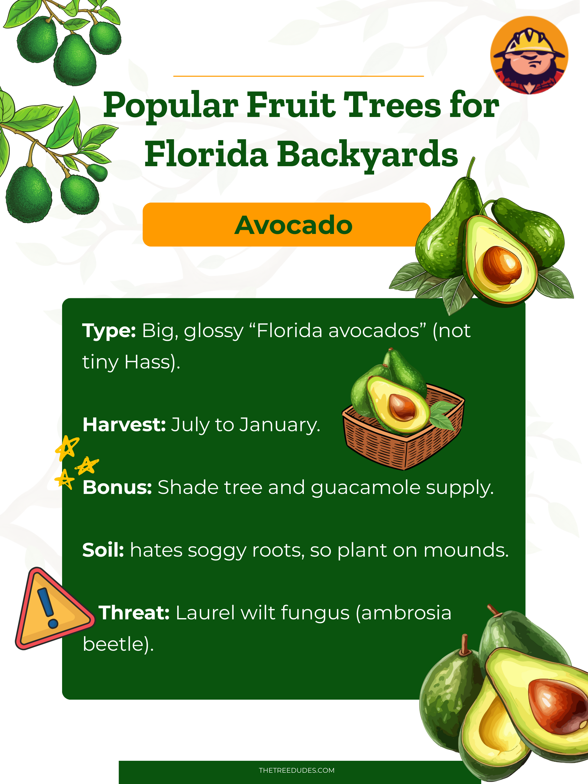 Si el mango es el rey de las frutas de Florida, el aguacate podría ser la reina. Ricos, cremosos y repletos de nutrientes, los aguacates de Florida son un favorito en el jardín. No son los pequeños, negros y desdichados aguacates Hass que se ven en los supermercados. Florida produce aguacates grandes, de color verde brillante, a menudo llamados "aguacates de Florida", o incluso comercializados como SlimCados por su menor contenido de grasa, que pueden pesar más de medio kilo cada uno. Un árbol de aguacate maduro es un hermoso árbol de hoja perenne que puede alcanzar de 9 a 18 metros de altura, con una amplia copa de hojas brillantes. Planta uno y pronto tendrás guacamole para toda la vida, además de un magnífico árbol de sombra para esas tardes calurosas.
