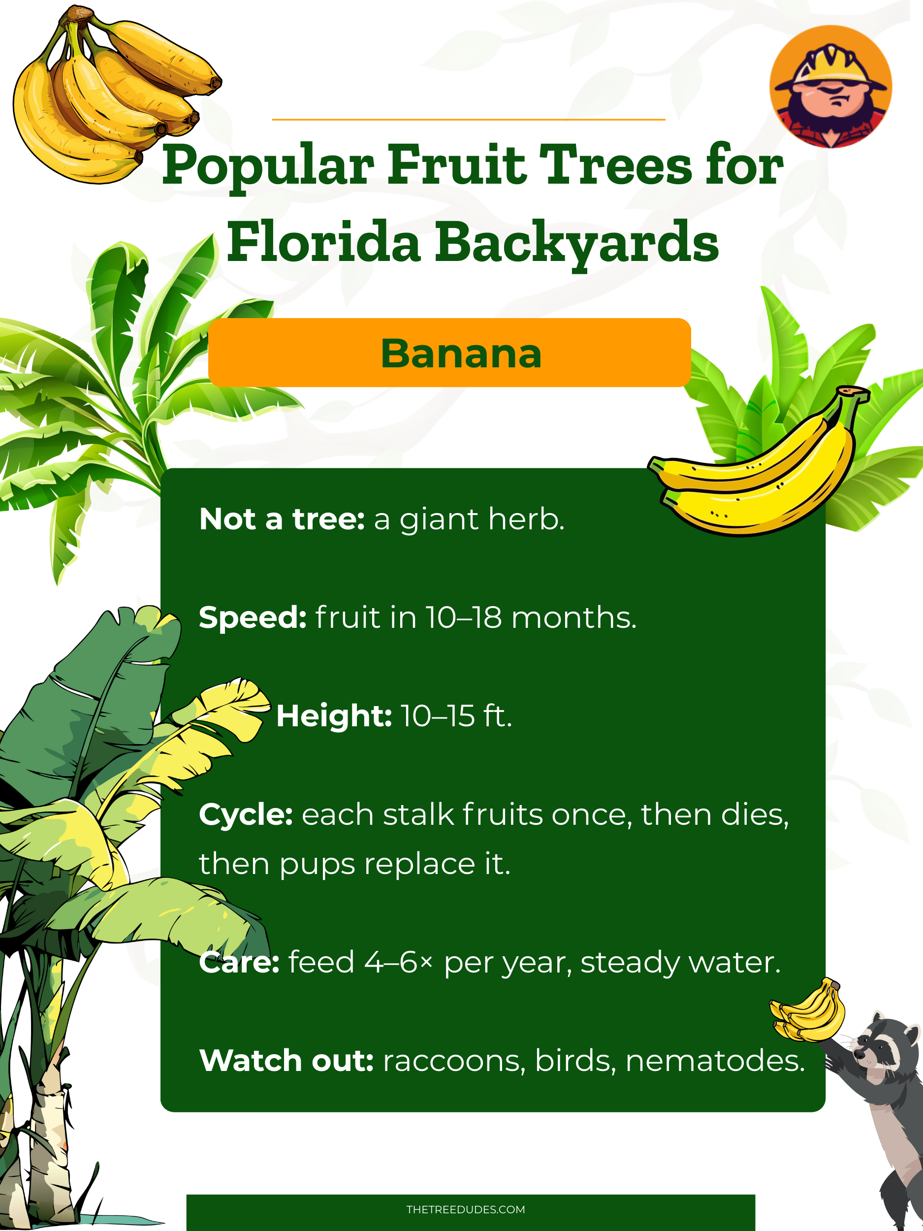Para un ambiente selvático instantáneo y una cosecha rápida de fruta, los bananos son una opción fantástica. Técnicamente, los bananos no son árboles, sino hierbas gigantes, pero a menudo los llamamos bananeros por su altura. En Florida, los bananos se pueden cultivar prácticamente en cualquier lugar, desde los Cayos hasta el Panhandle, siempre y cuando se tenga en cuenta que las heladas los quemarán y posiblemente los derribarán en zonas más frías.