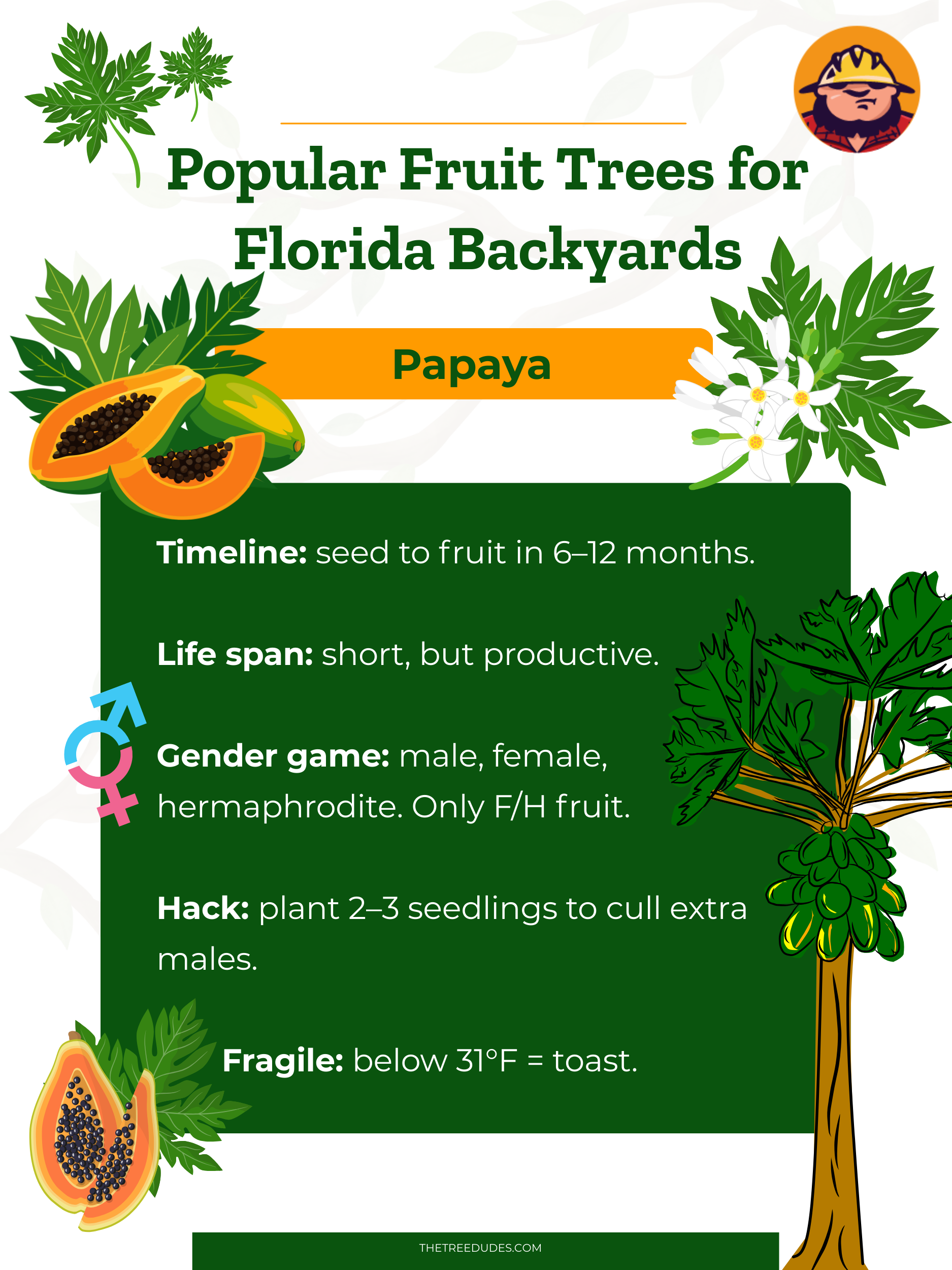 Algunos jardineros incluso las trasplantan al interior o a un invernadero para el invierno de Florida si quieren mantenerlas vivas en un clima ligeramente más fresco. En esencia, la papaya no tolera el frío ni los vientos fuertes, la sequía ni la tierra pobre, por lo que prospera en el sur de Florida.