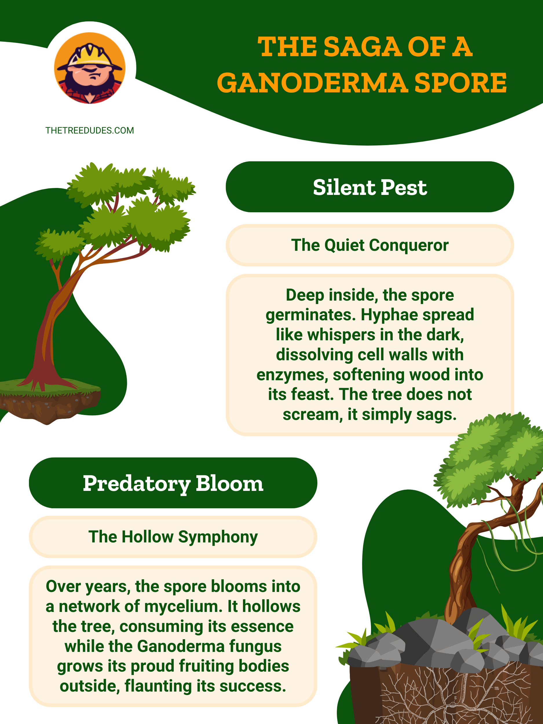 Ganoderma, en particular Ganoderma sésil, es un hongo que descompone la madera y cuyo apetito de destrucción no tiene límites. Piense en él como un parásito con un plan maestro: infiltrarse en los sistemas vasculares de los árboles y consumir su sangre vital desde adentro hacia afuera. Todo comienza con una toma de posesión silenciosa antes de convertirse en signos obvios, como un tronco que ha perdido su fuerza, una corteza que se está descascarando y, finalmente, una avería.