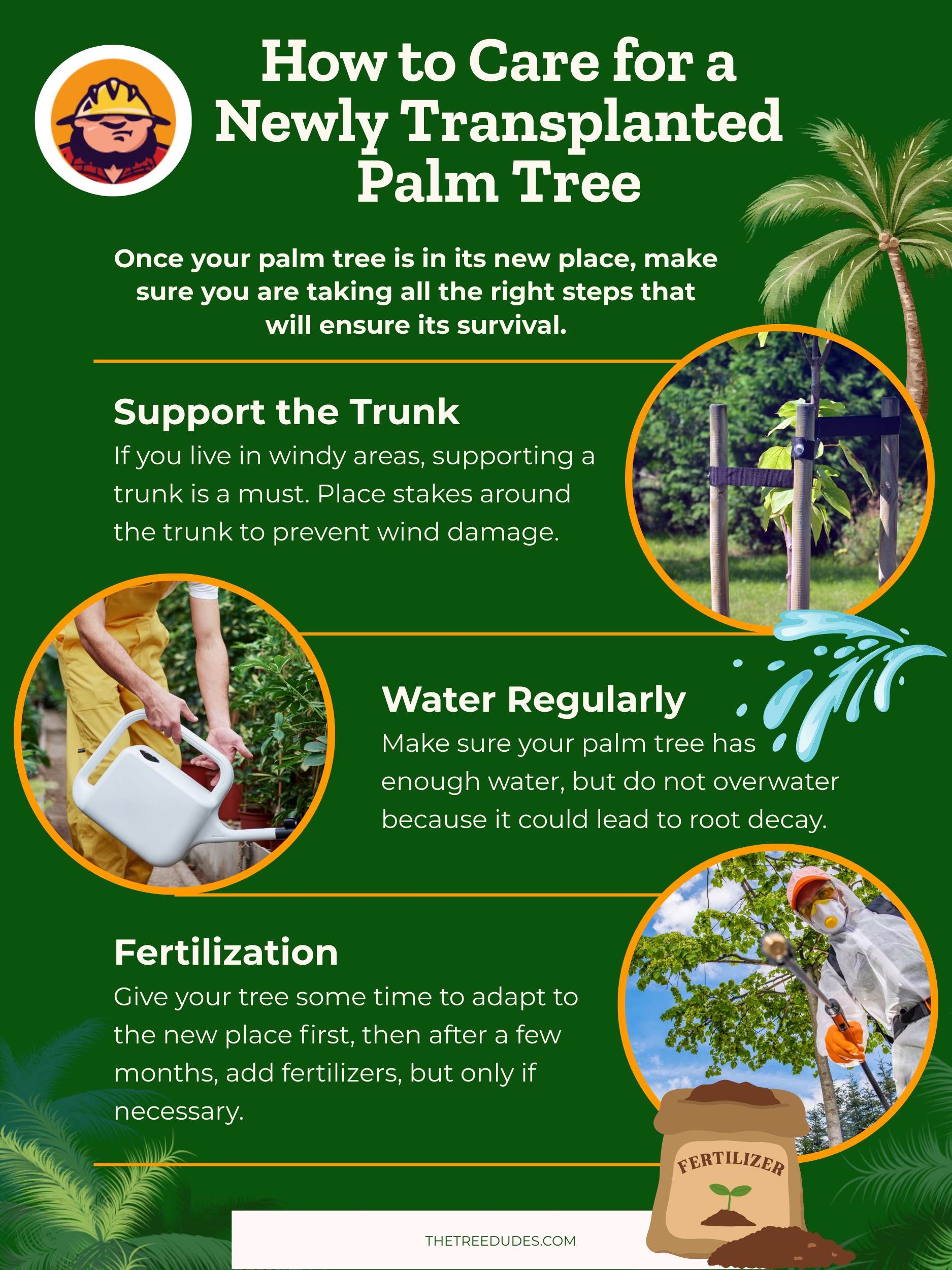 Una de las primeras cosas que debe hacer después de trasplantar la palmera es darle soporte adicional al tronco. Debido a que las raíces aún no se han asimilado, la palmera es frágil, e incluso una pequeña ráfaga de viento podría arrancarla del suelo.