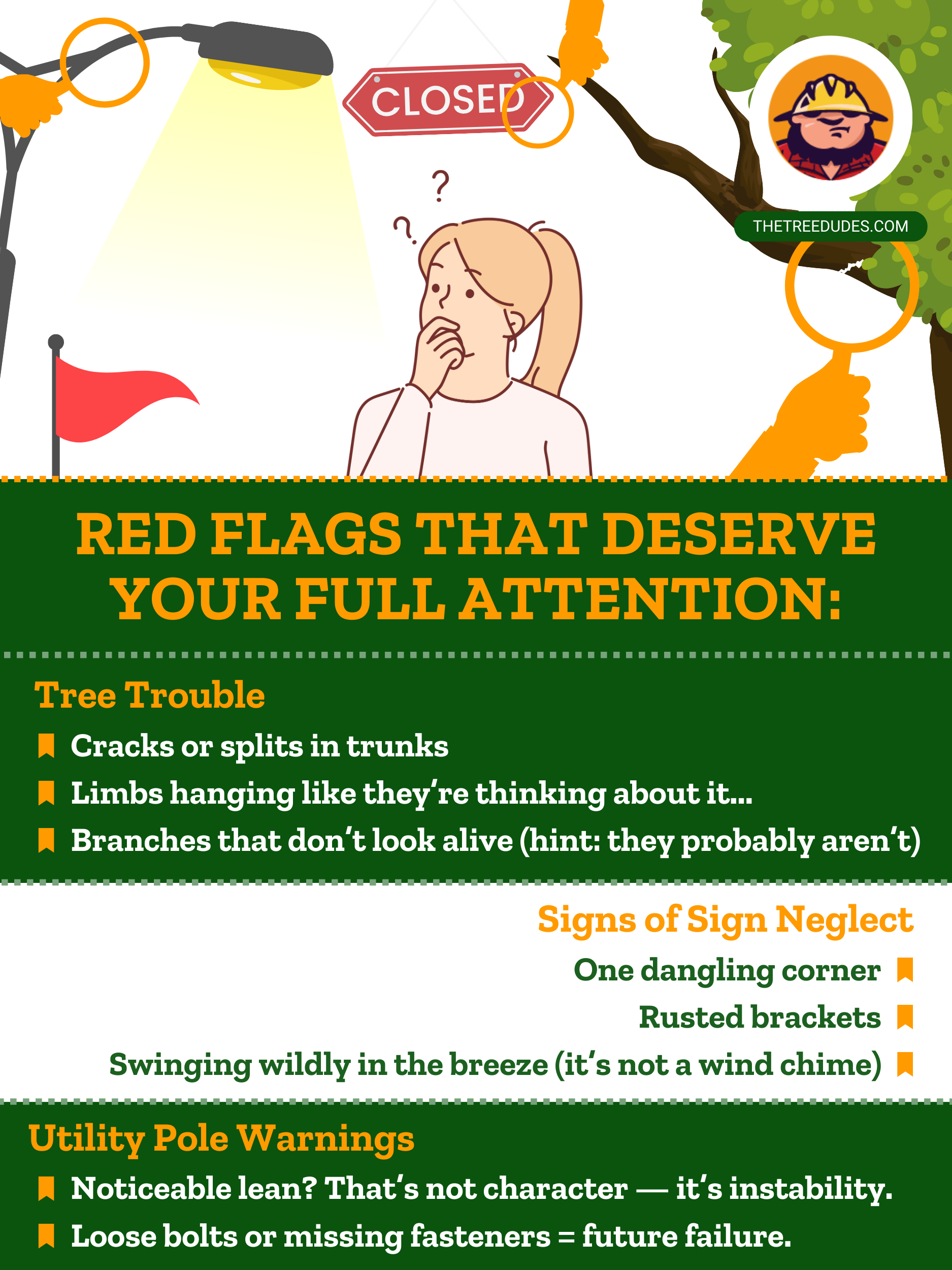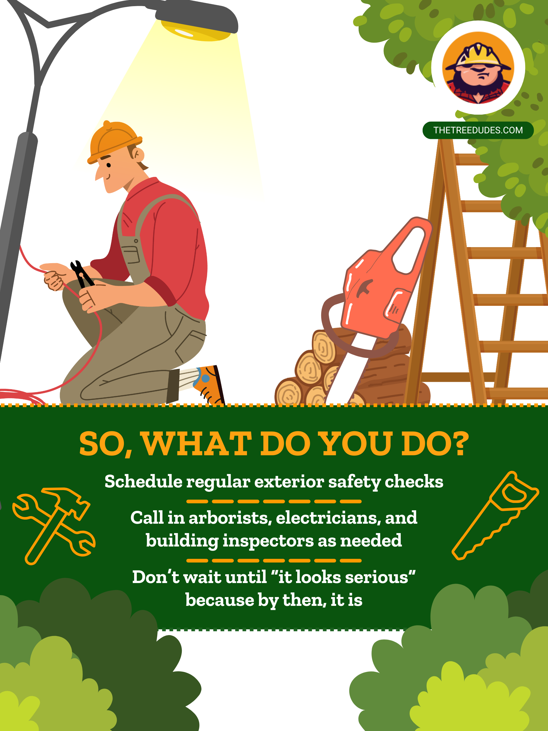 • Árboles caídos o inclinados: Un árbol grande apoyado sobre un cable eléctrico o un edificio es un accidente a punto de ocurrir.