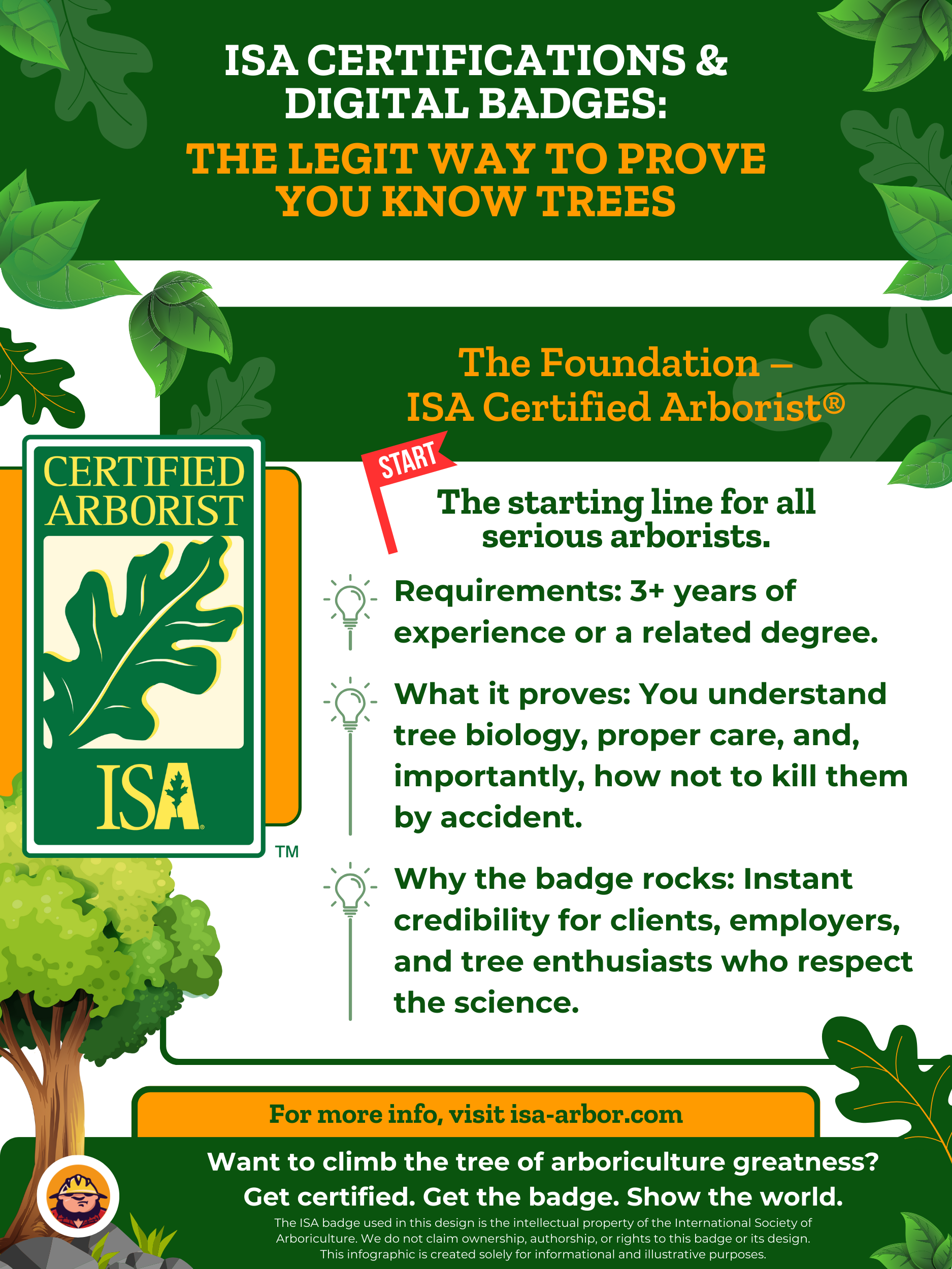 La Sociedad Internacional de Arboricultura (ISA) es una institución de conocimiento y experiencia. Se sitúa entre los entusiastas aficionados y los La gente busca verdaderos profesionales para contratarPero seamos honestos, los títulos y las credenciales no se refieren solo a lo que sabes, sino a demostrarlo de manera tangible y presentar tus calificaciones de una manera que diga más que las palabras.