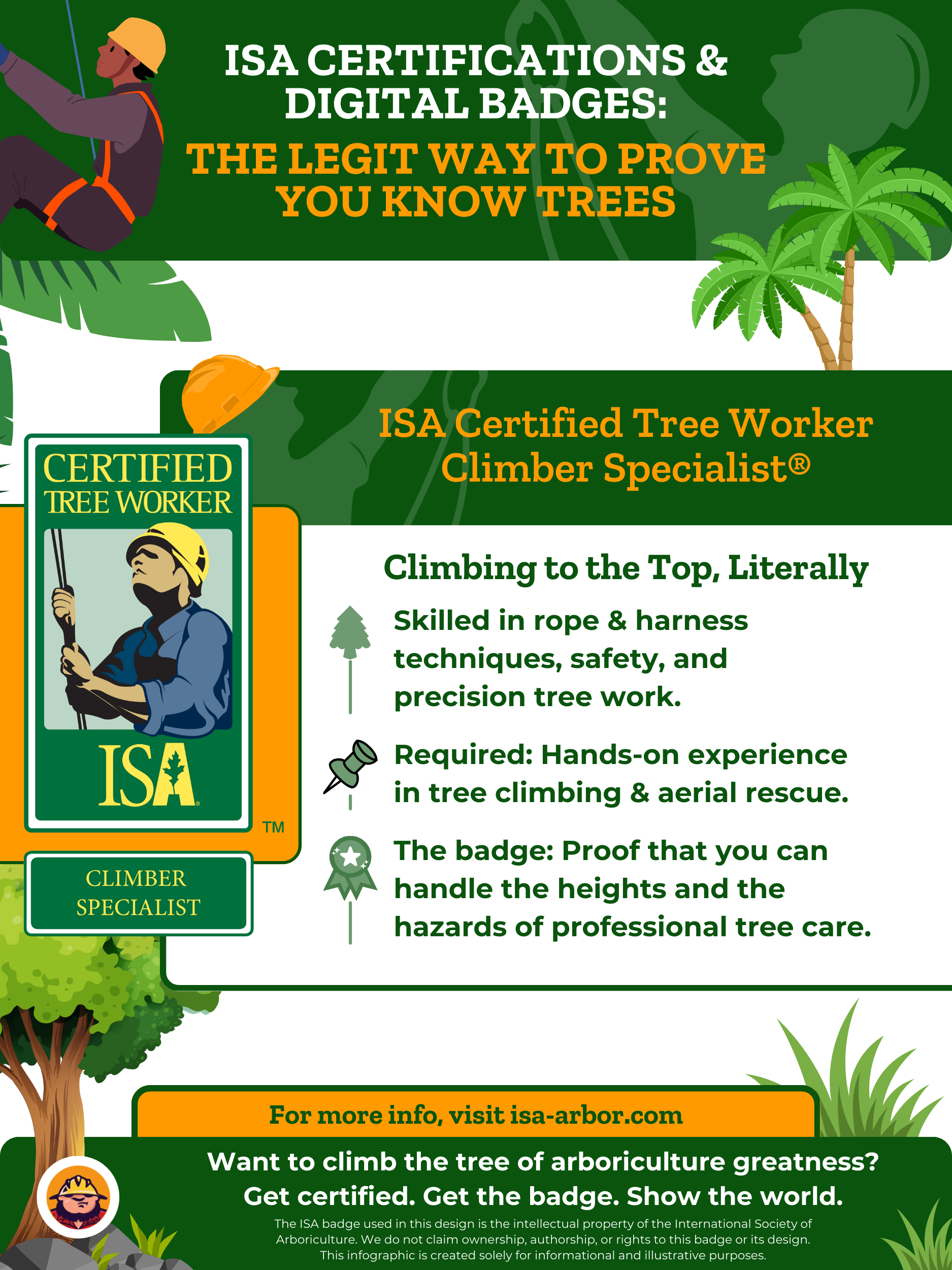 Entonces, ya escalas árboles como un profesional, pero ¿quieres una ventaja adicional? La certificación de especialista en escalada de árboles certificado por la ISA está diseñada para trabajadores de árboles que se especializan en trepar.
