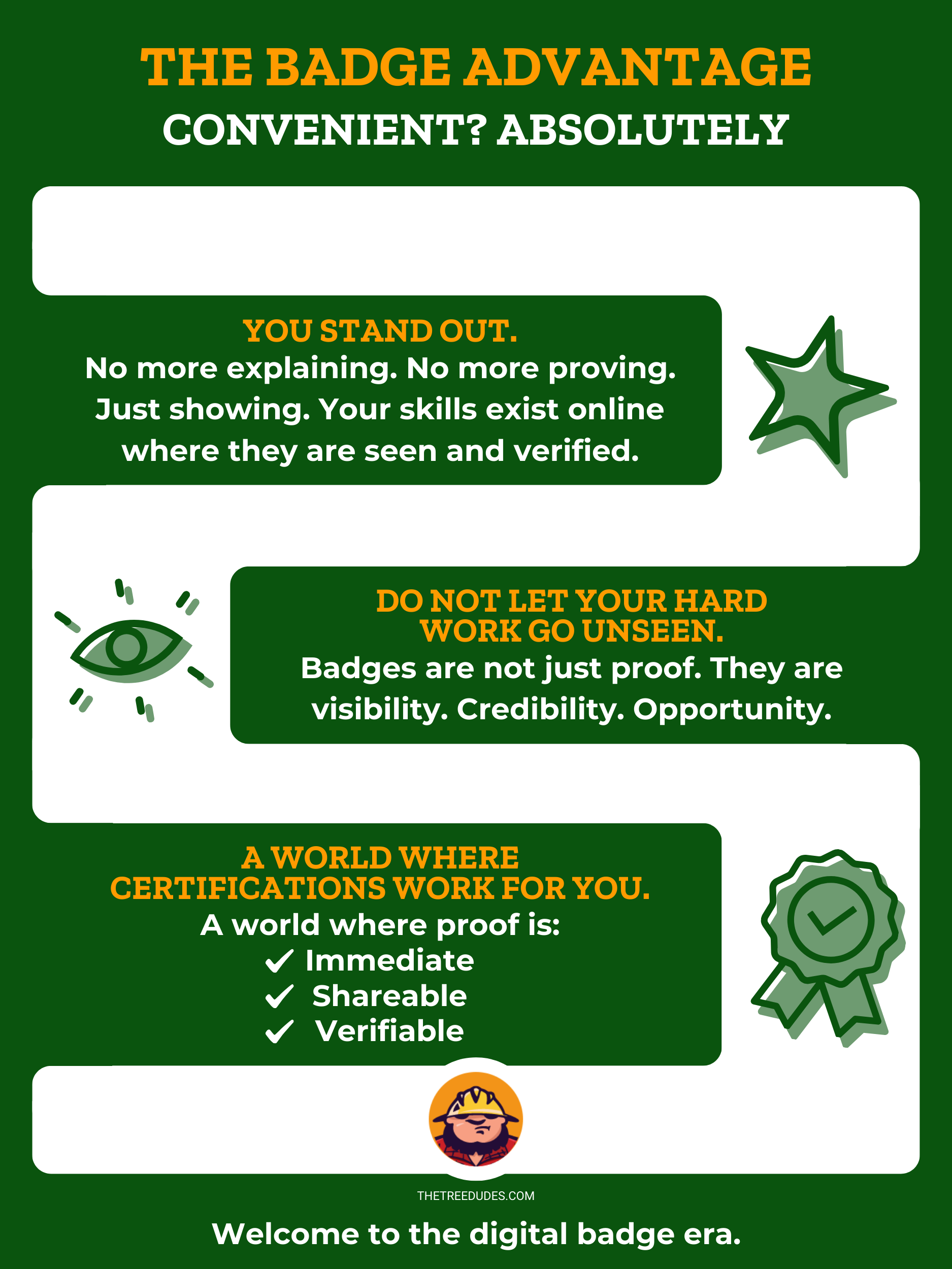 Necesitas al menos 2000 horas de experiencia en este campo para poder optar a este puesto. La insignia digital les dice a todos que no solo trabajas con árboles, sino que trabajas con árboles en entornos de alto riesgo.