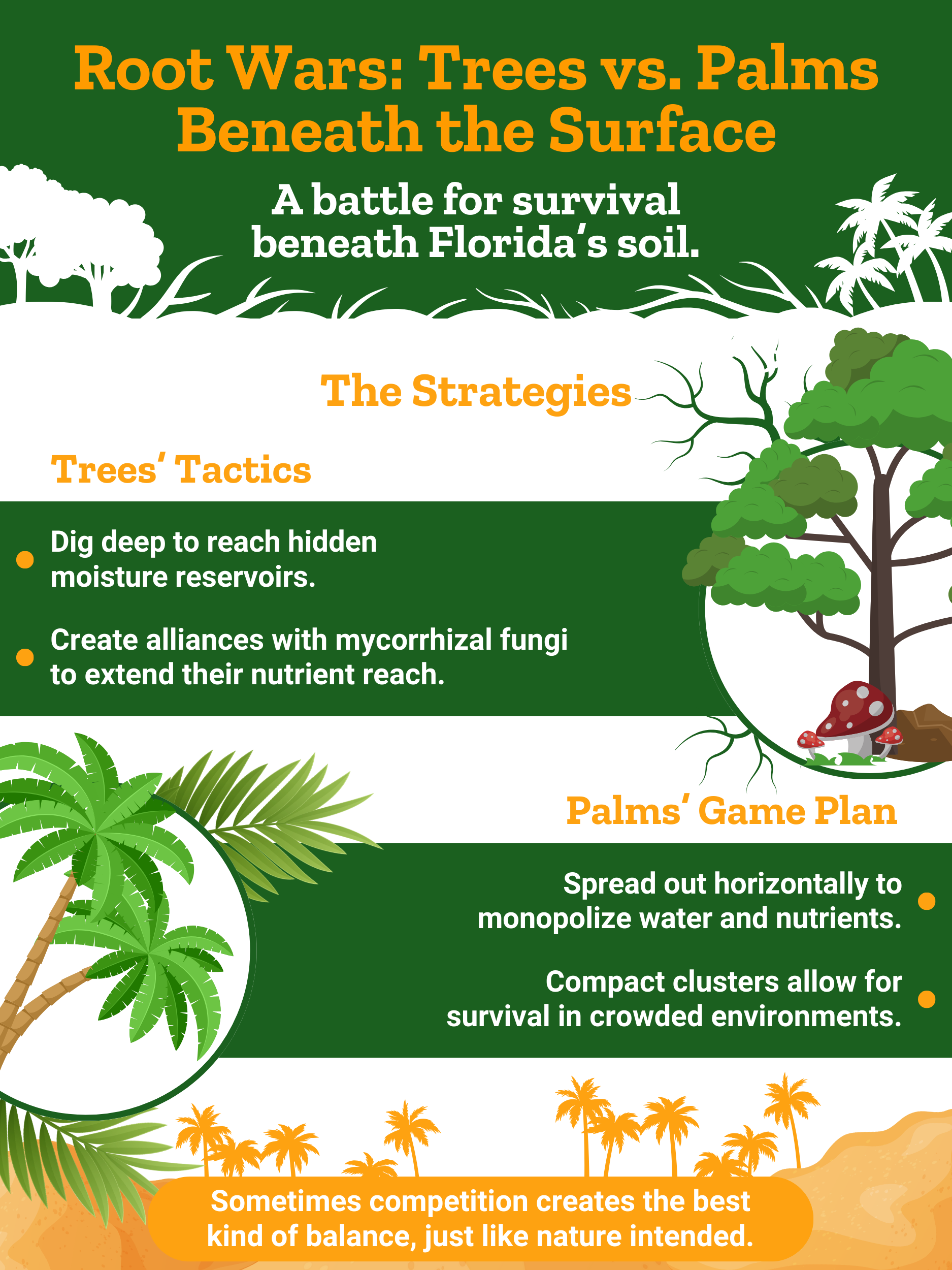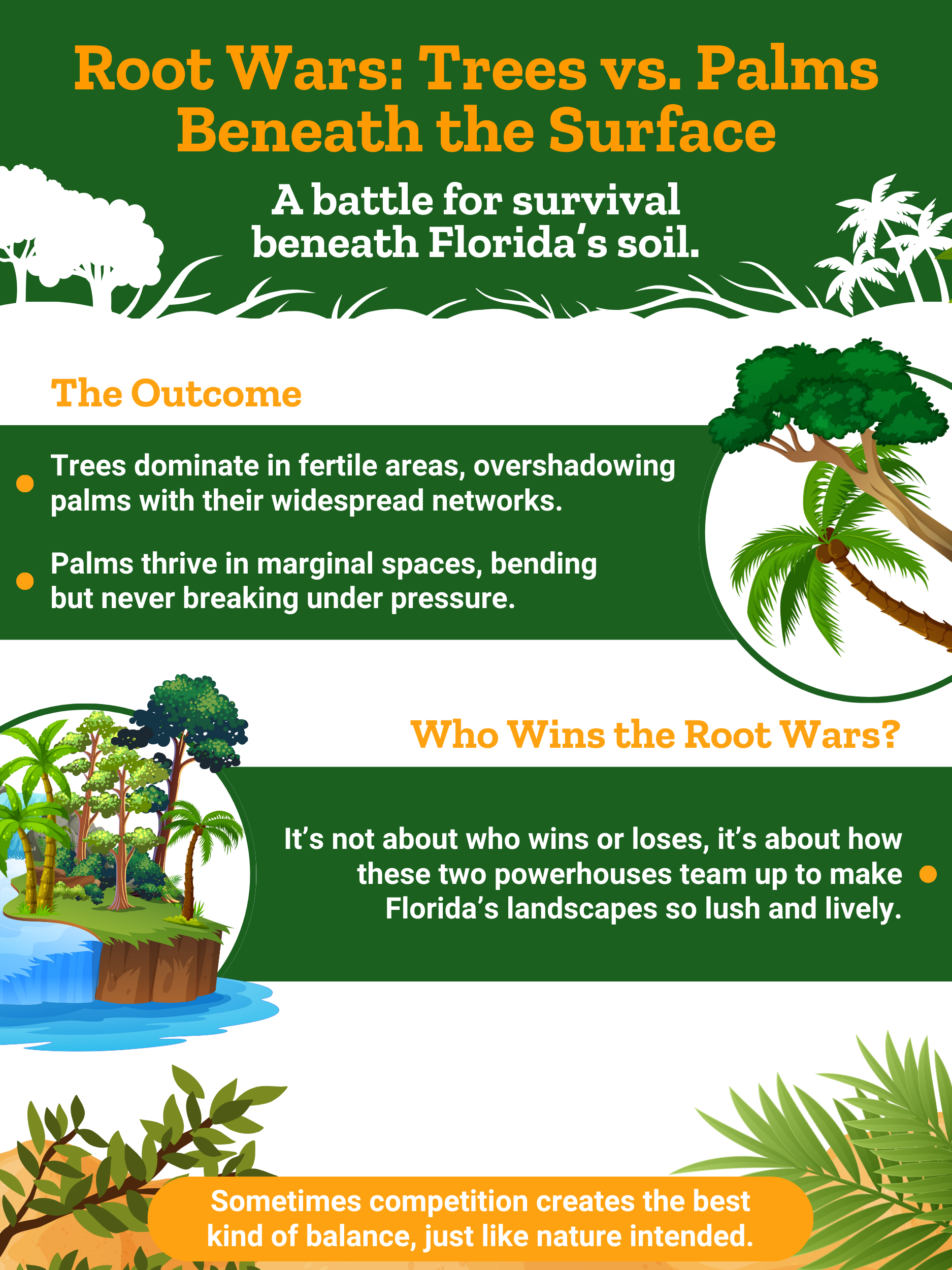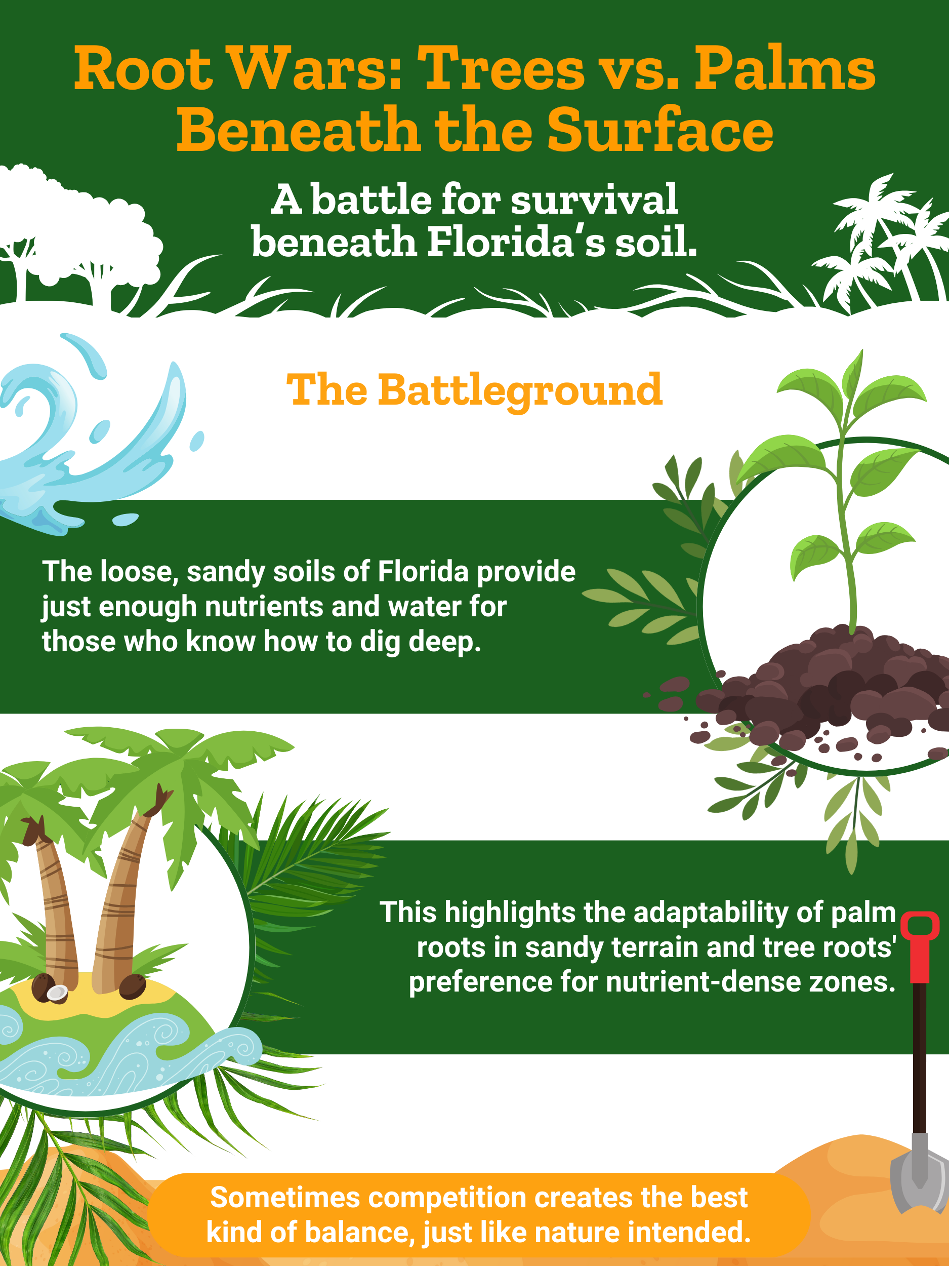 • Competencia por recursos: Tanto los árboles como las palmeras necesitan luz solar, agua y nutrientes. Sin embargo, sus sistemas de raíces funcionan de manera diferente. Los árboles suelen tener redes de raíces expansivas que pueden competir con las palmeras por los recursos subterráneos. Esto puede crear tensión en espacios reducidos.