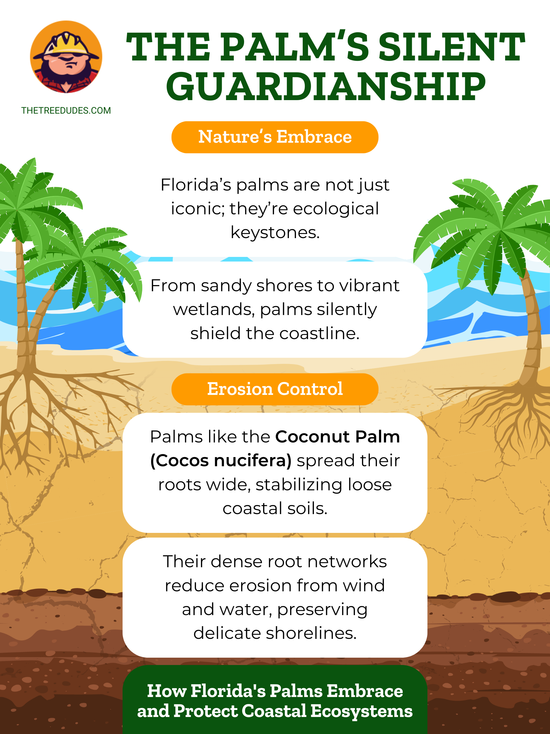 Esta belleza tropical, que crece en suelos arenosos bañados por el sol y besada por vigorizantes brisas saladas, añade un toque vibrante al paisaje. Esta palmera es mucho más que un árbol, es como un pequeño pedazo de paraíso que espera que lo visites y te pierdas en su tranquilidad. Sus fuertes raíces la mantienen firme, ayudando a proteger la costa de la erosión y contribuyendo al rico ecosistema de las costas de Florida.