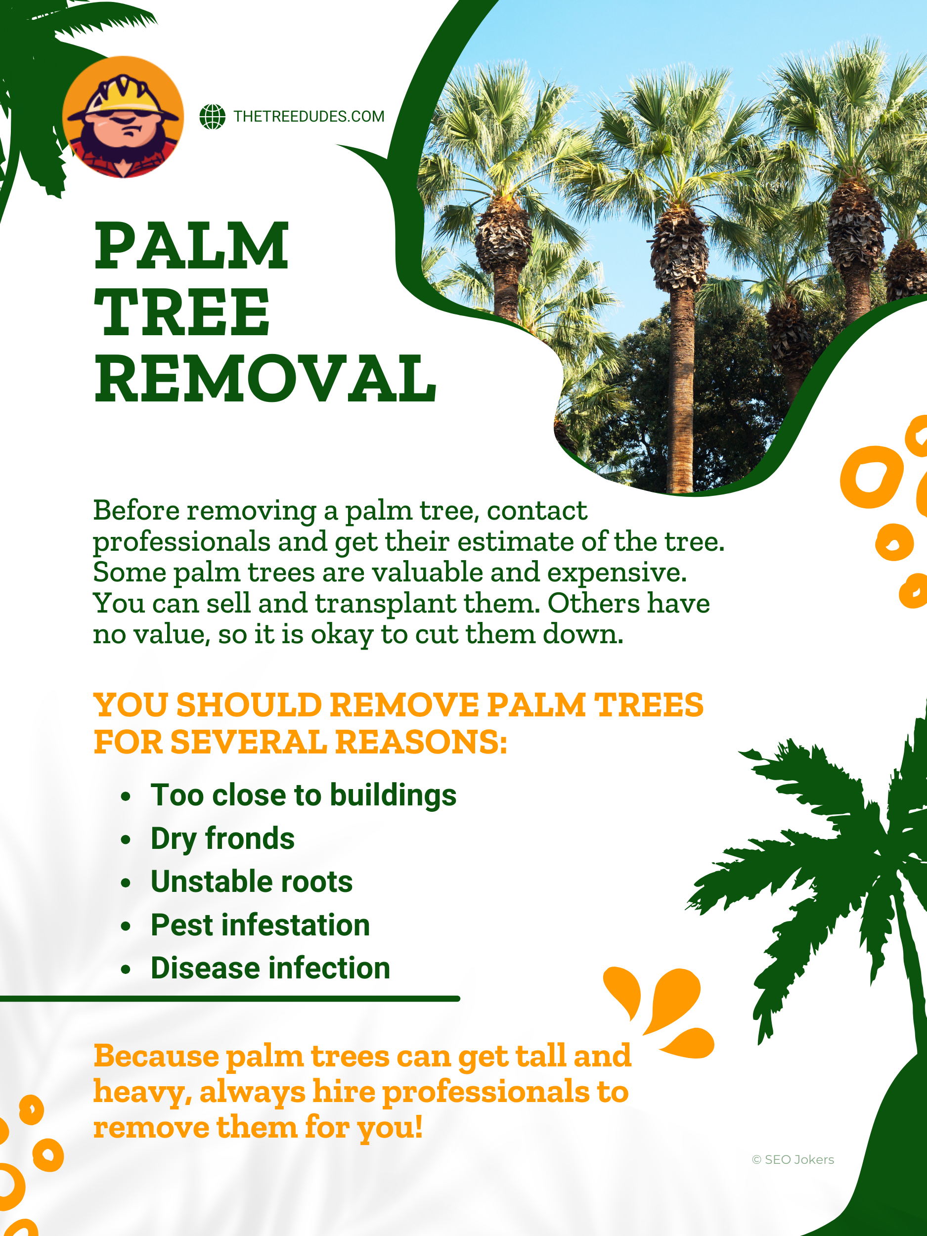Dejar las palmeras desatendidas durante mucho tiempo puede generar problemas de seguridad. Por ejemplo, si una palmera tiene raíces inestables o está inclinado hacia un lado, es sólo cuestión de tiempo que caiga y destruya todo lo que encuentre a su paso, incluidos edificios, vehículos, vallas y otros árboles. En caso de tormenta tropical o huracán, estas palmeras no podrán resistir los fuertes vientos y causarán aún más daños.
