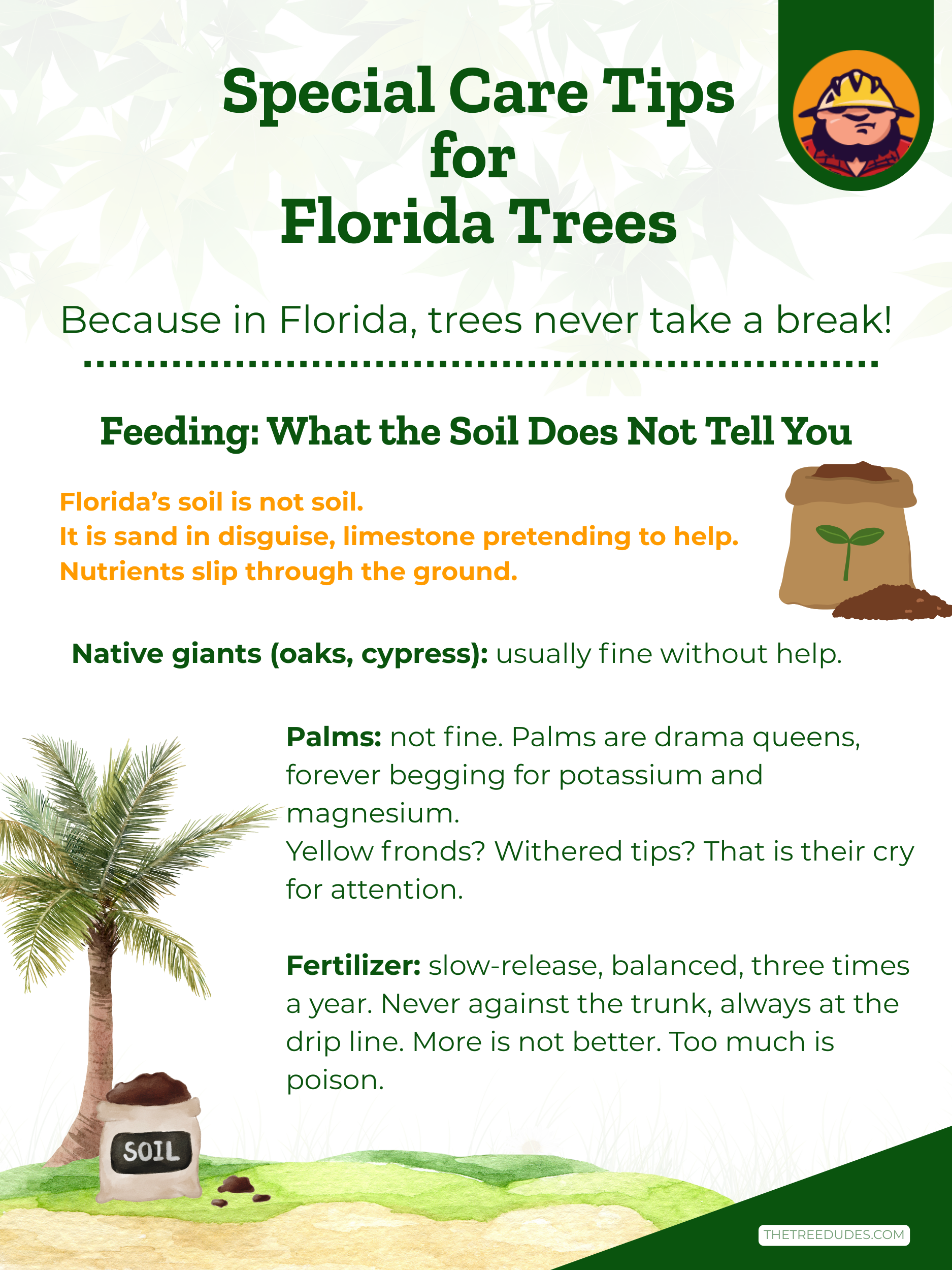 El suelo de Florida es famoso por ser arenoso y, a menudo, pobre en nutrientes. En muchas zonas de Miami-Dade y Broward, el "suelo" podría ser arena de playa mezclada con piedra caliza. Esto significa que los árboles no siempre obtienen todos los nutrientes que necesitan solo del suelo. La fertilización puede ayudar, pero debe hacerse con prudencia.