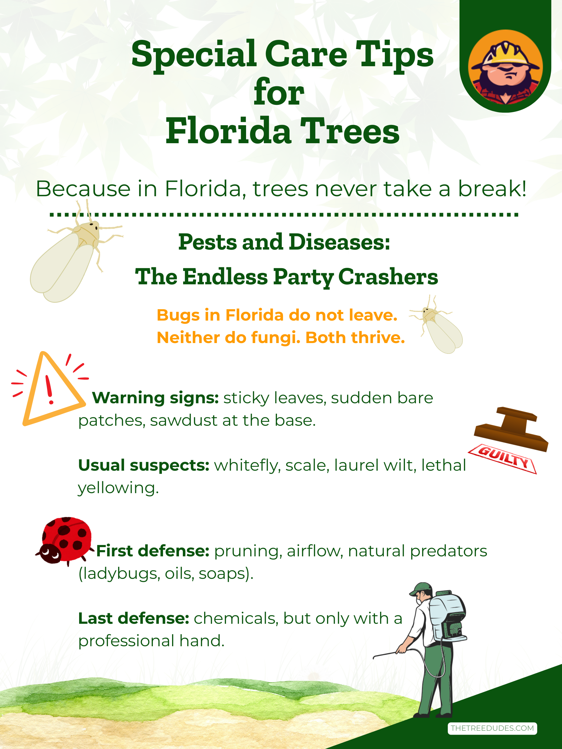 Los problemas comunes en el sur de Florida incluyen: mosca blanca espiral en los árboles de limbo y olivos negros, mosca blanca del ficus en los setos de ficus y diversas escamas en palmeras y arbustos. En cuanto a enfermedades, encontramos problemas como marchitez fúngica y plagas. La marchitez del laurel ha arrasado con varios aguacates y laureles de pantano nativos. La marchitez del roble, aunque no es tan frecuente en el sur de Florida, puede afectar a ciertos robles. Y, como se mencionó, el amarillamiento letal o su pariente, la declinación de las palmeras Phoenix de Texas, puede matar palmeras como la especie Phoenix y algunas variedades de coco.