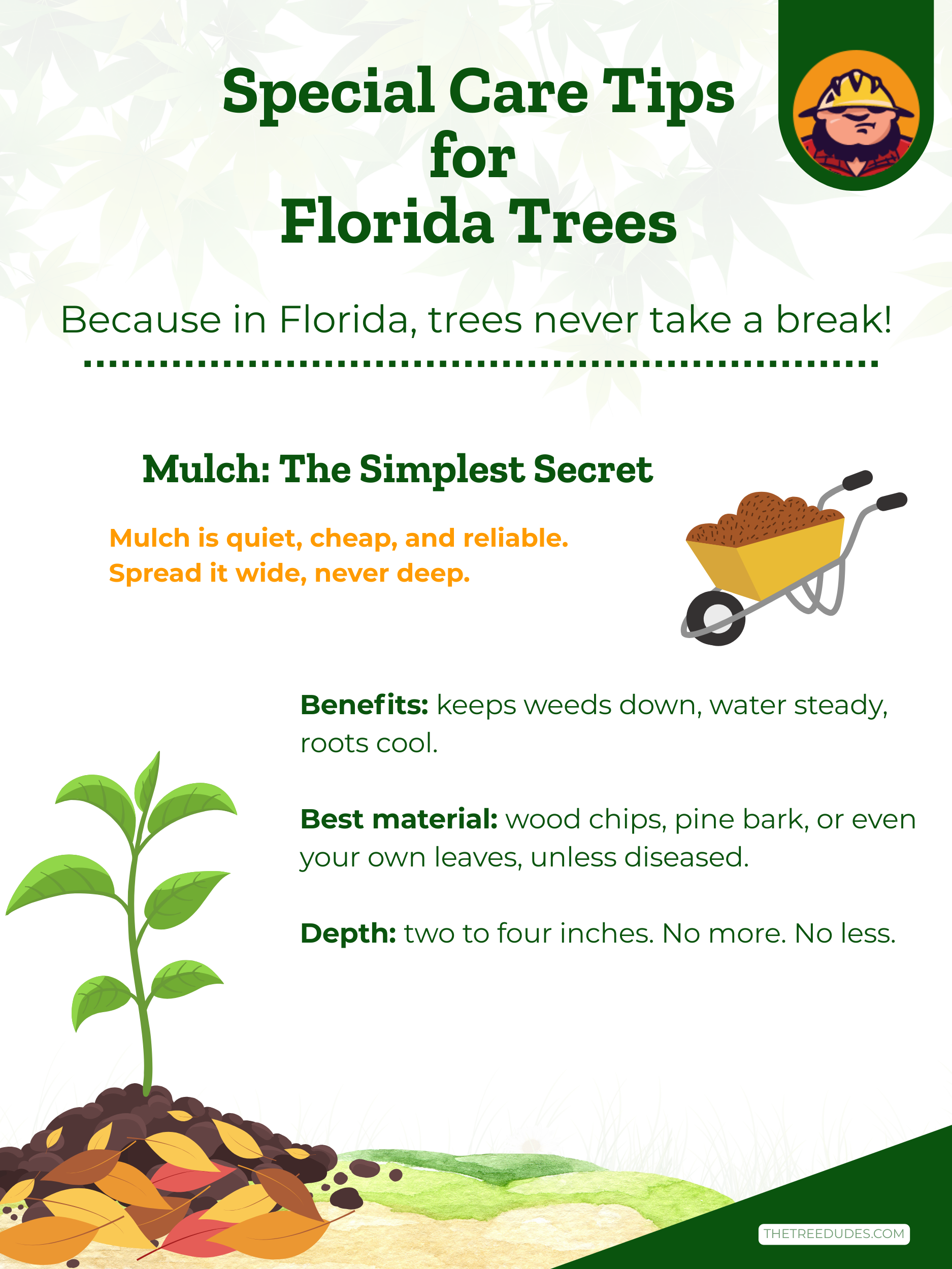 El clima de Florida puede provocar mucha lluvia de golpe y luego no dar ninguna durante semanas. Tu trabajo como cuidador de árboles es amortiguar un poco esos extremos. Conserva parte de esa abundancia de la temporada de lluvias en el suelo con mantillo y complementa durante las épocas secas con una manguera. El resultado: un árbol sin estrés hídrico es más fuerte y resistente en general.