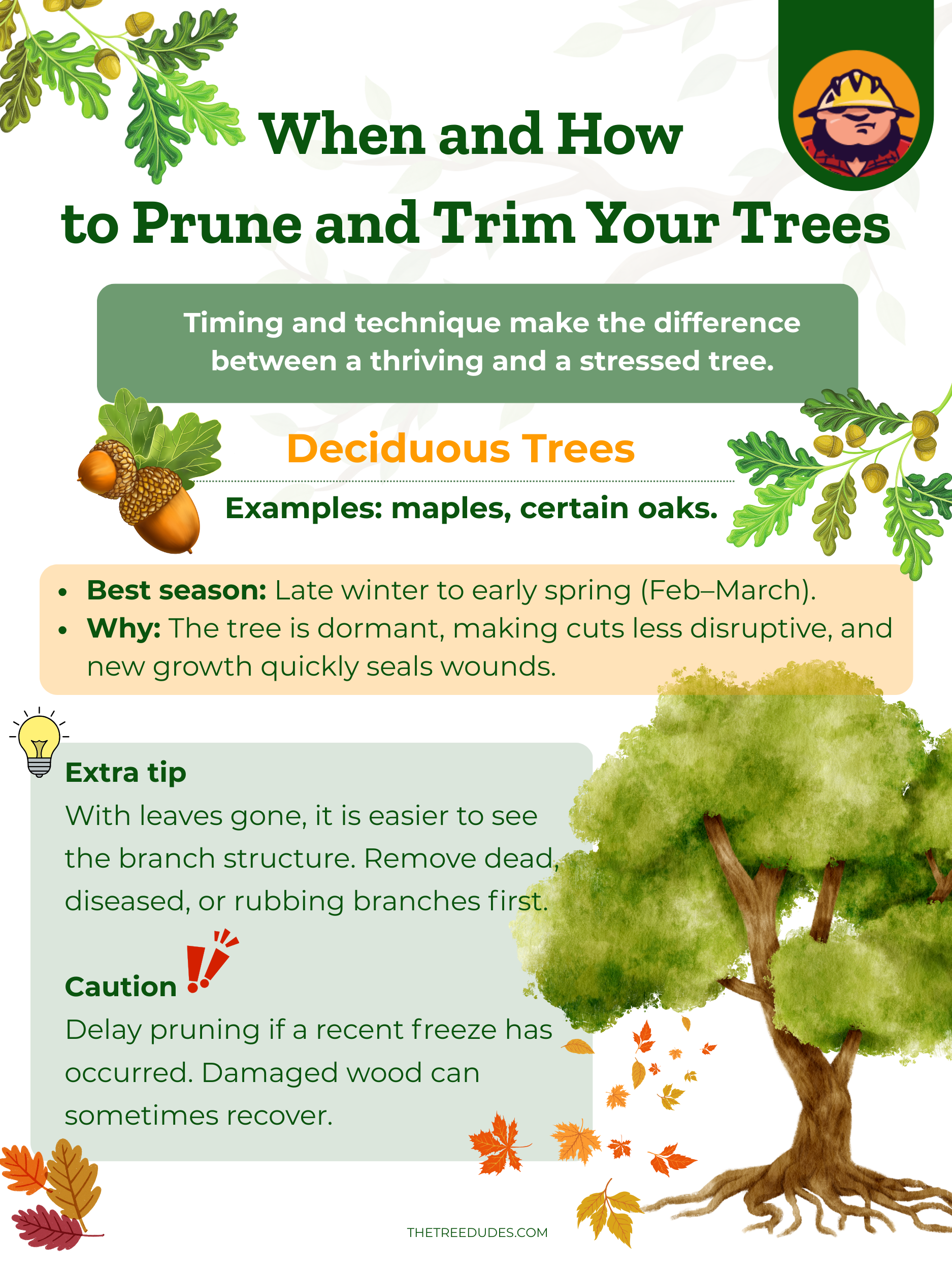 Los árboles caducifolios, aquellos que pierden sus hojas en otoño o invierno, como los arces o ciertos robles, tienen un período de letargo, incluso en Florida. El mejor momento para podar árboles caducifolios en Florida suele ser entre finales del invierno y principios de la primavera, justo antes de que comience el nuevo crecimiento. A finales de febrero o marzo, en el sur de Florida, estos árboles se preparan para echar hojas nuevas.