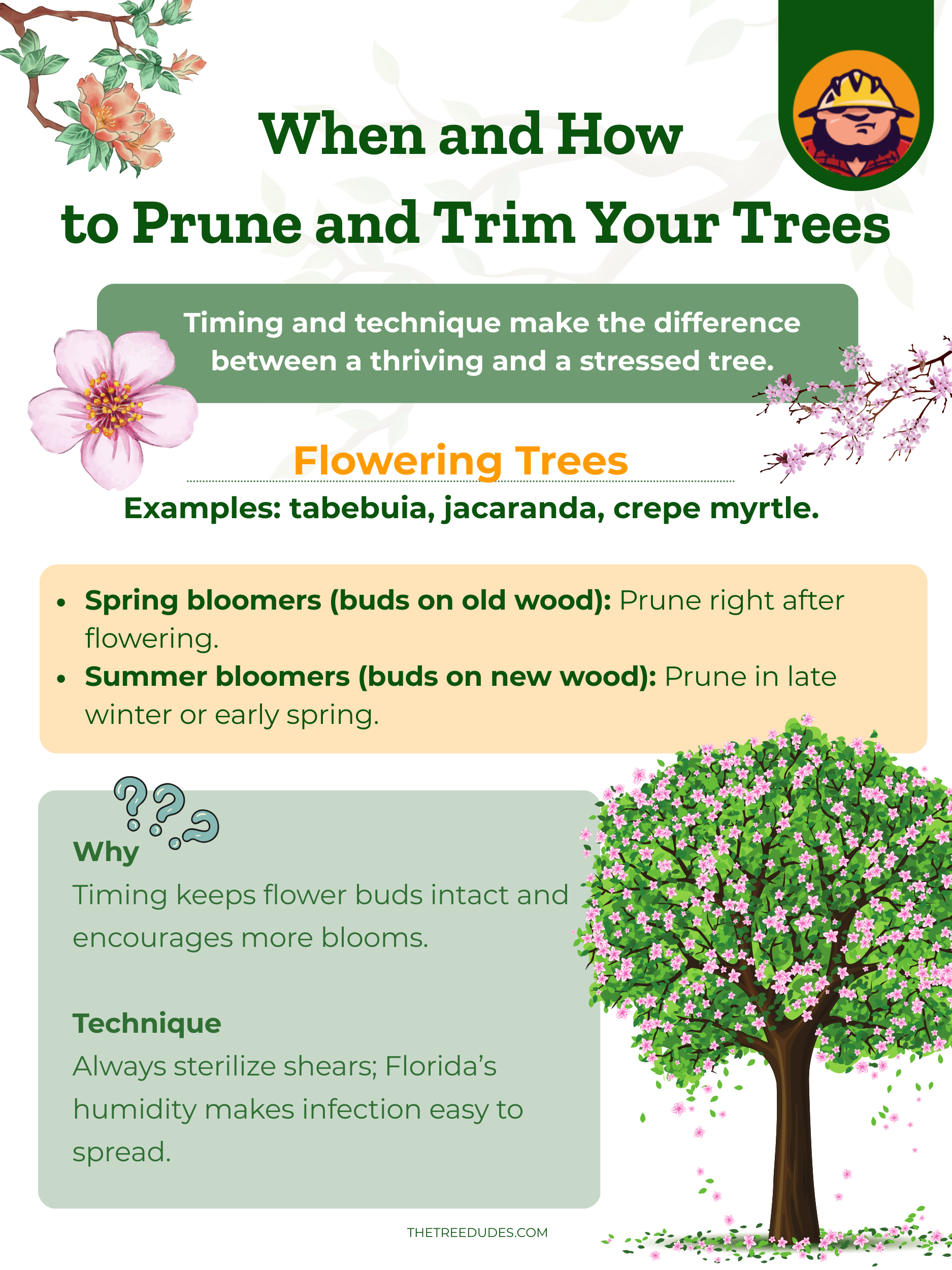 Los árboles florecientes de Florida son legendarios. Desde las prumerias hasta las jacarandas y las magnolias. Para que sus flores se mantengan brillantes, el momento de la poda es fundamental. Después de la floración, conviene podar los árboles que florecen a finales de invierno o primavera. Muchos de estos árboles desarrollan sus capullos en la madera del año anterior. Por ejemplo, nuestras preciosas tabebuias o casias. Esas impresionantes flores amarillas o rosadas que se ven en primavera provienen de las ramas más viejas.