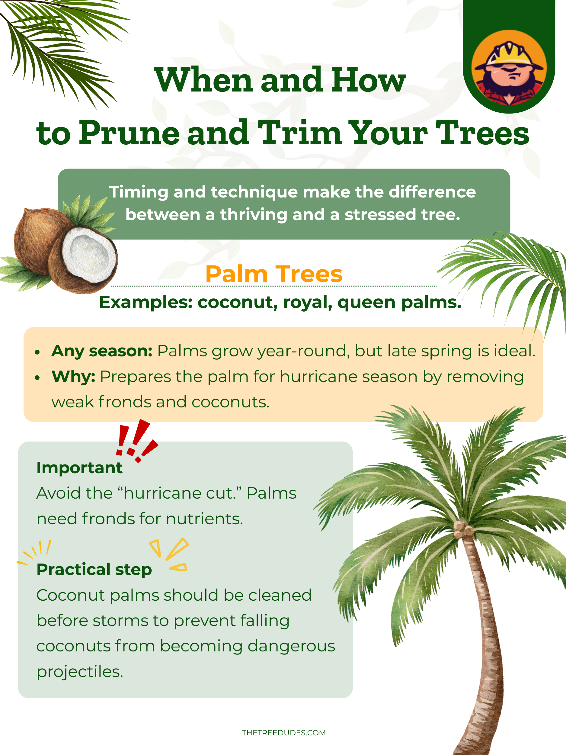 Una palmera sana pierde naturalmente sus hojas muertas. La razón principal para podar una palmera es eliminar las hojas marrones o amarillentas por estética y evitar que se caigan de forma impredecible, así como los tallos de las flores o semillas si no se quiere un desastre de semillas como el que dejan las palmeras reina. Además, en el sur de Florida, una razón muy práctica para podar las palmeras es la eliminación de los cocos. Si tiene cocoteros, esos hermosos cocos pueden convertirse en balas de cañón durante una tormenta. Lo ideal es podar los cocos antes de que comience la temporada de huracanes.