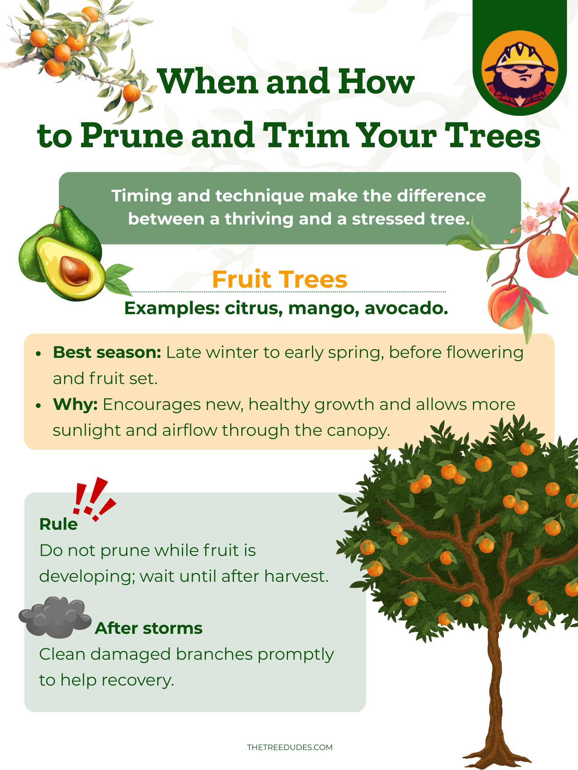 Un buen momento para podar árboles perennes es a finales de la primavera, alrededor de mayo, o a principios del verano, después de que hayan madurado los primeros brotes. ¿Por qué? Porque el árbol acaba de crecer y tendrá tiempo de recuperarse antes del siguiente ciclo de crecimiento. Podar a finales de mayo o junio también puede preparar al árbol para la próxima temporada de huracanes, eliminando el exceso de ramas. Sin embargo, generalmente conviene evitar podas importantes en pleno verano, ya que el calor y la humedad elevados pueden estresar al árbol y abrir las heridas de poda, lo que facilita una infección.