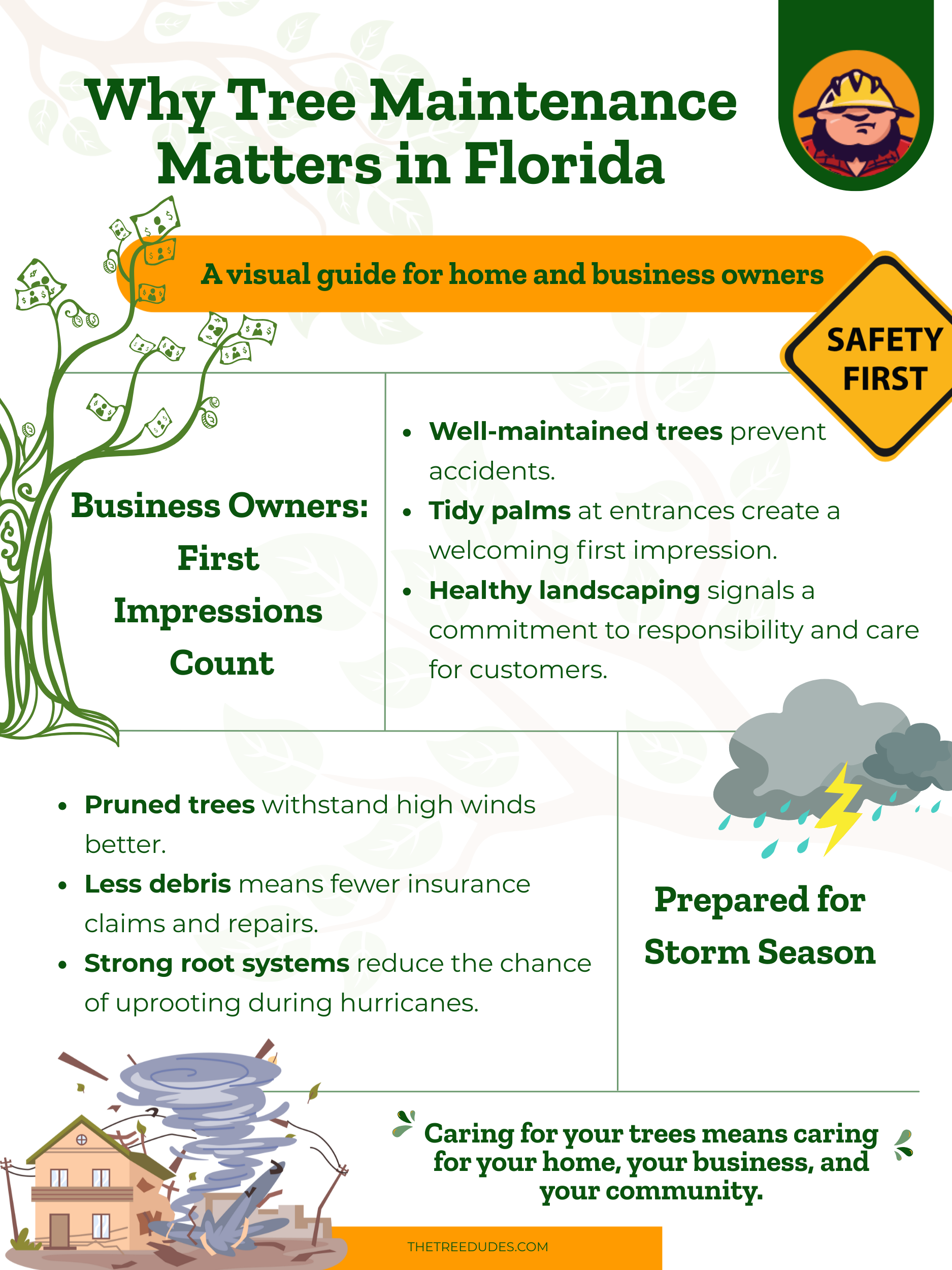 Para los propietarios de viviendas, la poda y la revisión regular de sus árboles pueden evitar que las ramas débiles se derrumben sobre el techo durante una de nuestras infames tormentas de verano. Para los dueños de negocios, el mantenimiento de las palmeras del estacionamiento y los árboles de la entrada no solo tiene fines estéticos. Protege a los clientes de la caída de escombros y demuestra que se preocupan por la apariencia de su propiedad. Los árboles sanos y podados también resisten mejor las tormentas, lo que significa una menor probabilidad de daños cuando los vientos de la temporada de huracanes empiezan a aullar.
