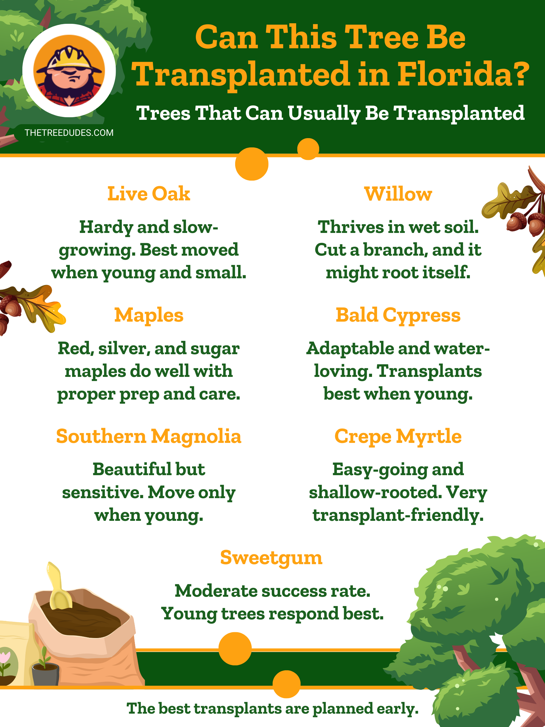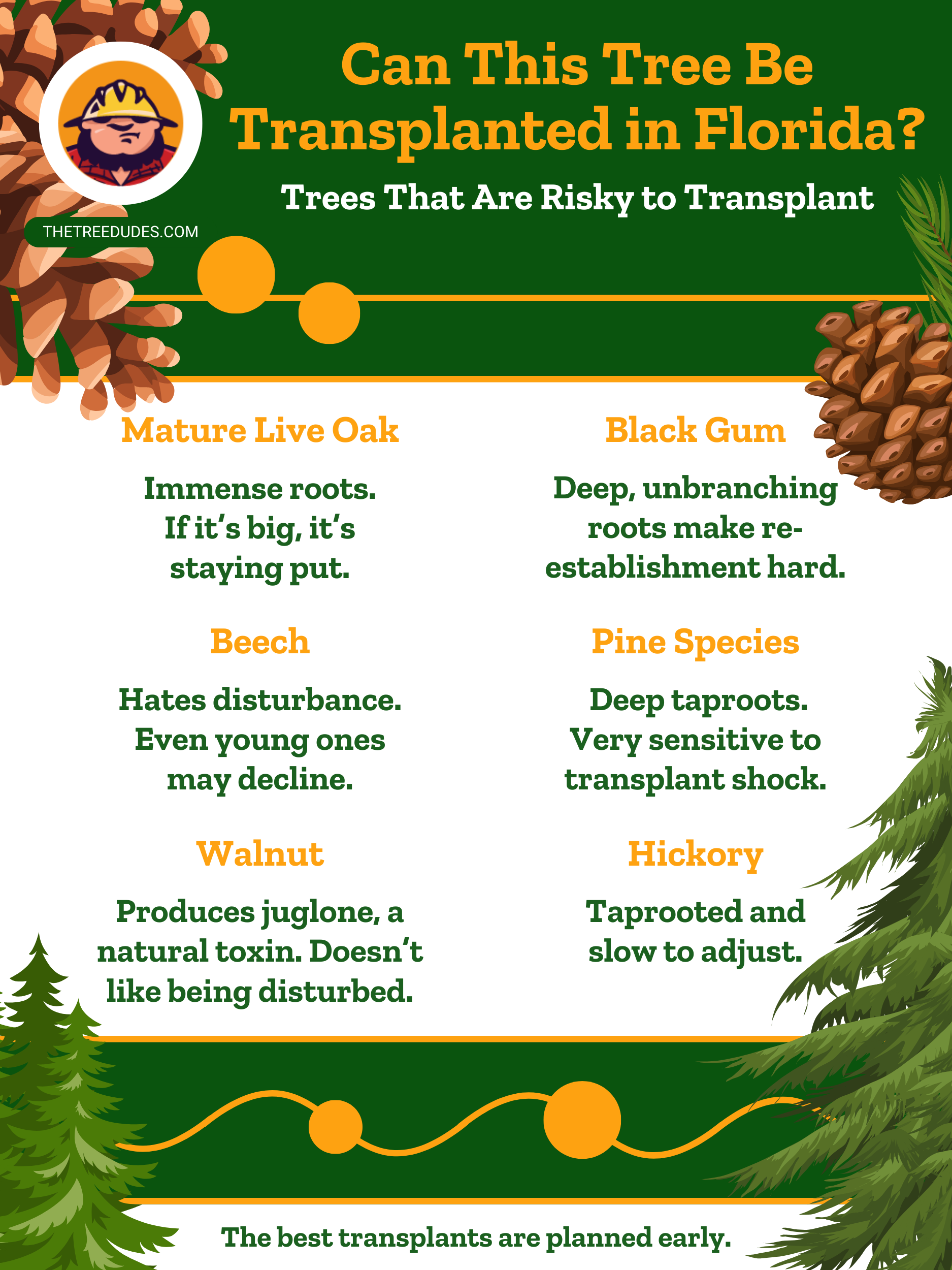 En Florida, también puede notar que algunas especies nativas se adaptan mejor cuando se las reubica dentro de la misma región. Están acostumbradas al clima que las rodea, saben cuándo va a llover, cuánto calor hace e incluso qué pequeños insectos pueden intentar molestarlas. Si se mantiene dentro de esos límites de microclima, aumentan las probabilidades de éxito. Al final, todo se trata de verificar la salud del árbol, el tamaño, el tipo y dónde está creciendo.
