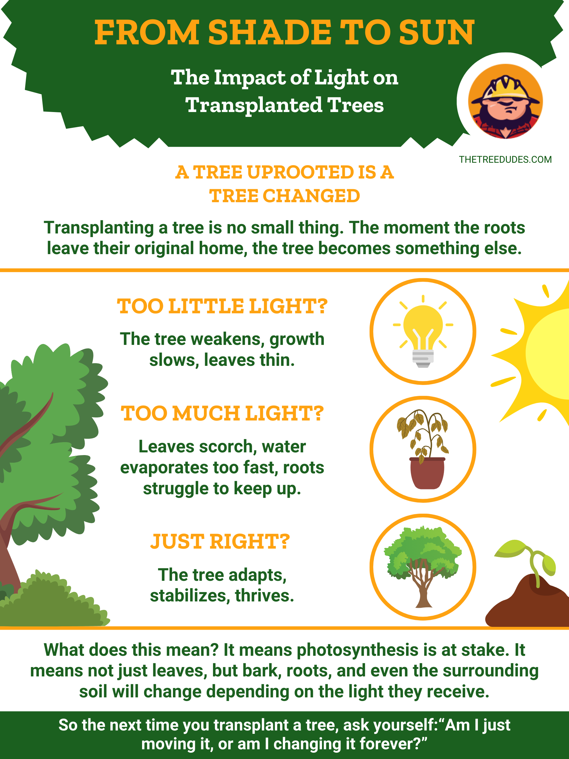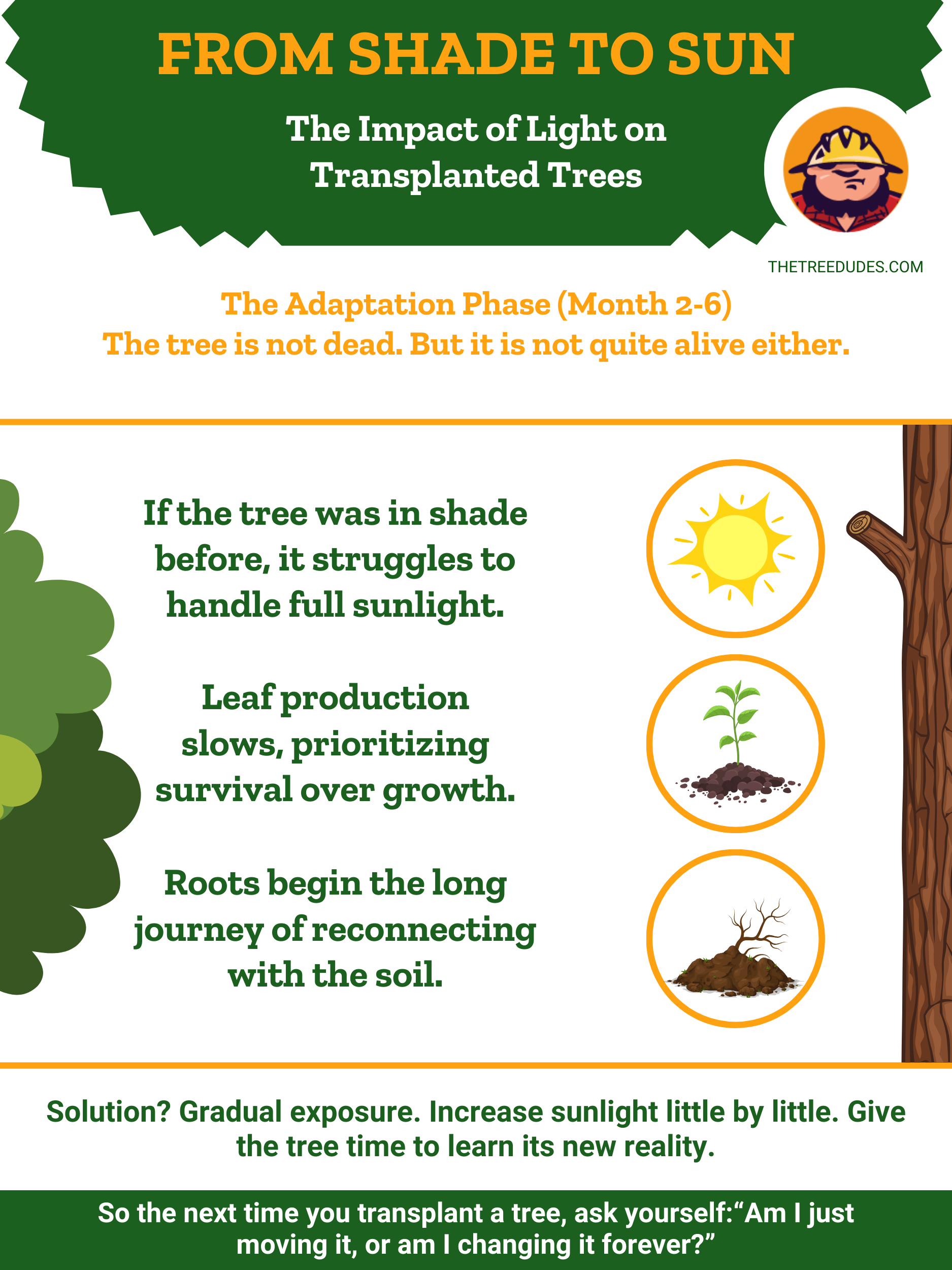 Incluso si un árbol parece estar en perfecto estado de salud, la nueva ubicación debe coincidir con la anterior en varios aspectos críticos. Los árboles reaccionan de manera similar a los cambios abruptos en el medio ambiente: la textura del suelo, el pH, el drenaje y la exposición al sol pueden influir en su capacidad de adaptación.
