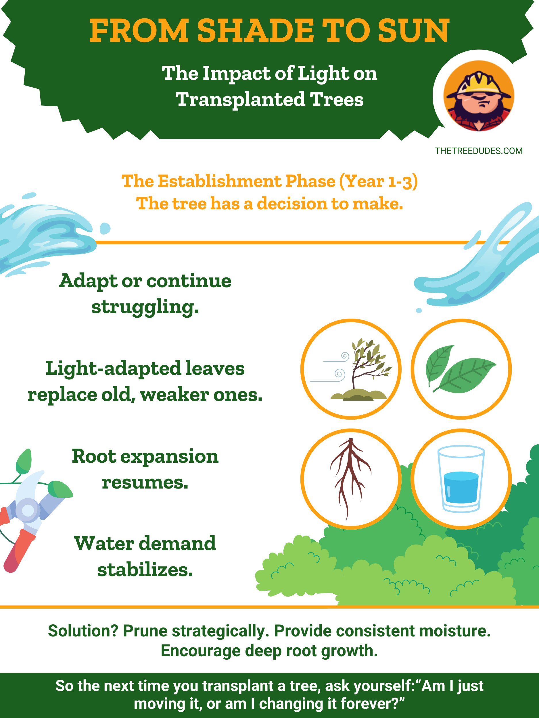 Ahora que ya tienes claros los conceptos básicos, piensa en el trasplante como si fuera una historia: tiene un principio, un desarrollo y un final claros, y todos trabajan juntos para darle al árbol la mejor oportunidad de tener un final feliz.