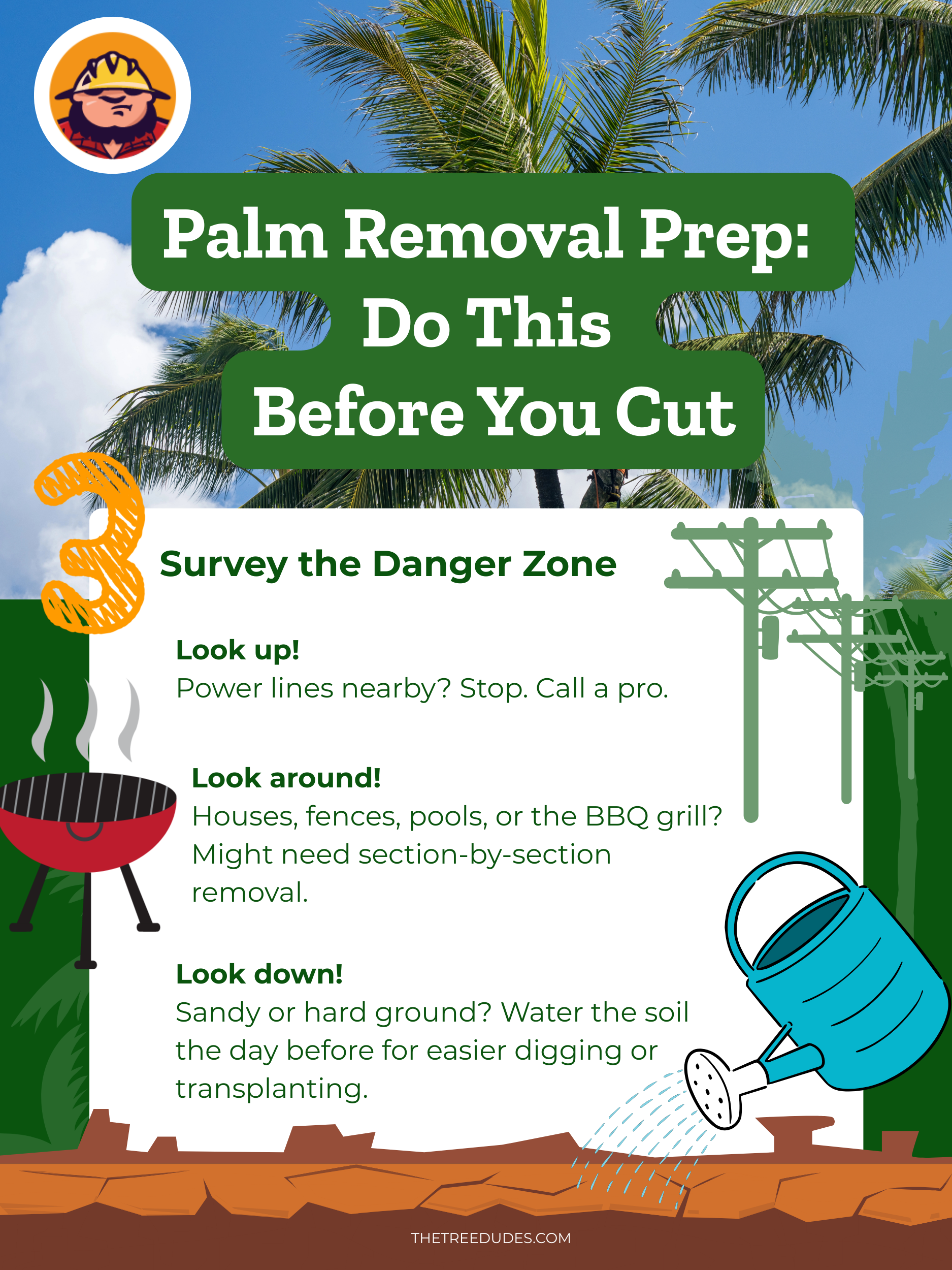 Take a slow walk around the palm and look at what is around it. Are there power lines running near or above it? If yes, stop. Call a professional arborist because trees plus power lines together are not for amateurs. Is the palm close to your house, a fence, or a pool? If so, you will likely need to remove it in sections to avoid crushing something. Palms often have a gentle lean, and they tend to fall in the direction they are leaning. Plan accordingly for where you want it to drop. Choose a clear landing zone if you intend to fell it in one piece. That zone should be at least as long as the tree is tall, preferably more, with no people, structures, or vehicles.