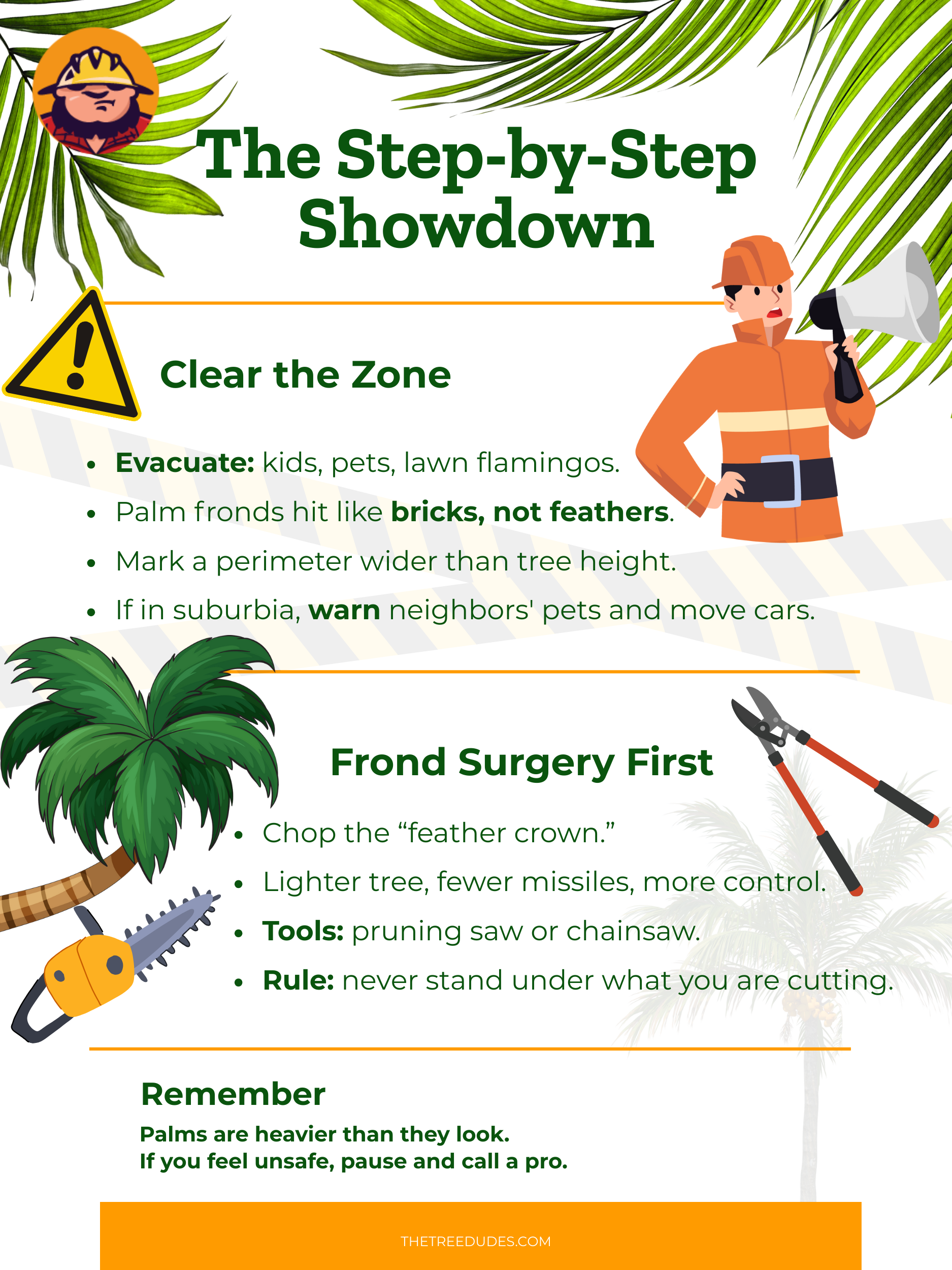 It is time to get down to business. We will go through this in the order you would typically do it, as if you are a DIY-er starting the job. However, please remember: if at any point you feel unsafe or unsure, or the job is bigger than you thought, pause and call a professional. There is no shame in knowing your limits. Palm trees can be unpredictable, and gravity is always waiting to prove us wrong.