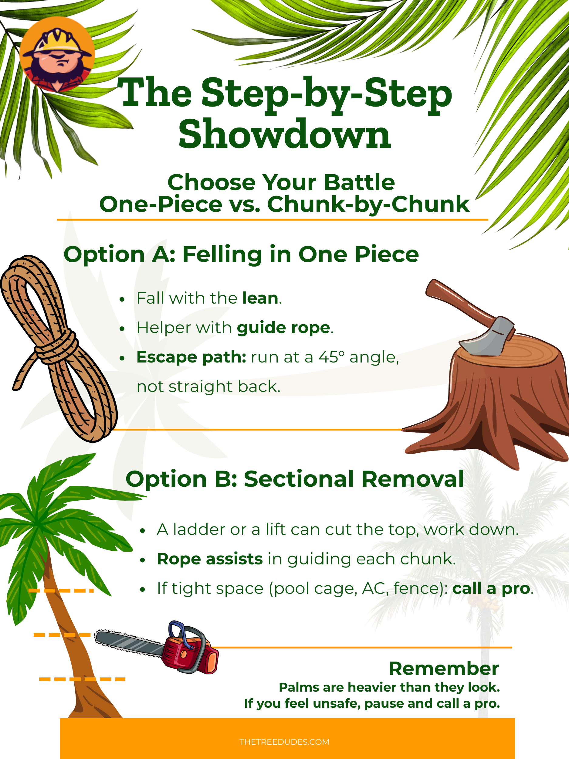 We are finally getting to the main part: bringing the trunk down. There are two primary ways to do this, and the choice largely depends on the size of the palm and its surroundings: