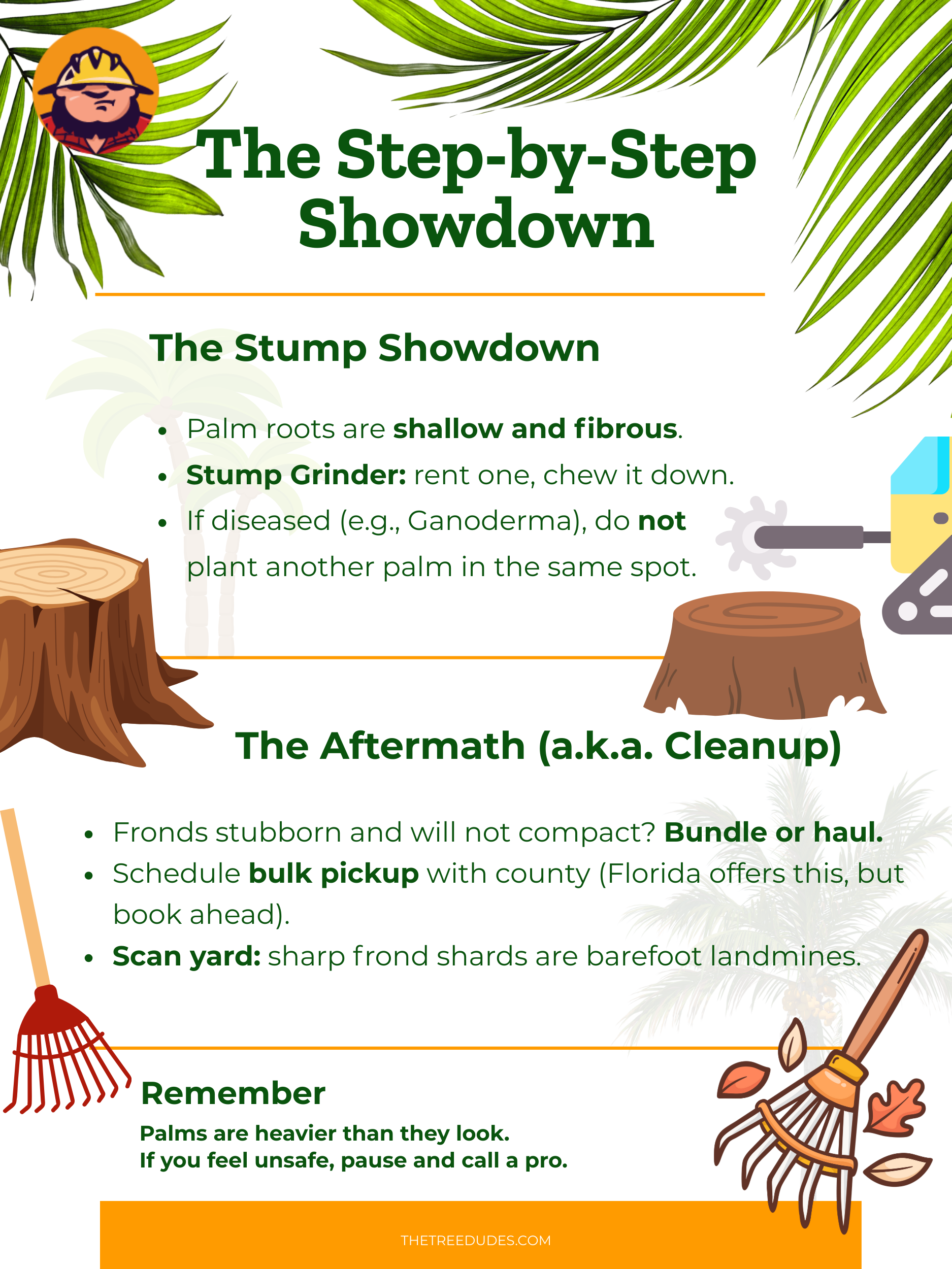 Florida’s sandy soils often hide utilities like sprinkler lines, plumbing, and cables. Dial 811 or your local utility locating service if you suspect any lines near the palm’s root zone, especially if you plan to grind or dig out the stump. It is a free service to mark utility lines. Hitting a water main or electrical line will ruin your day and your bank account. Safety first, always.