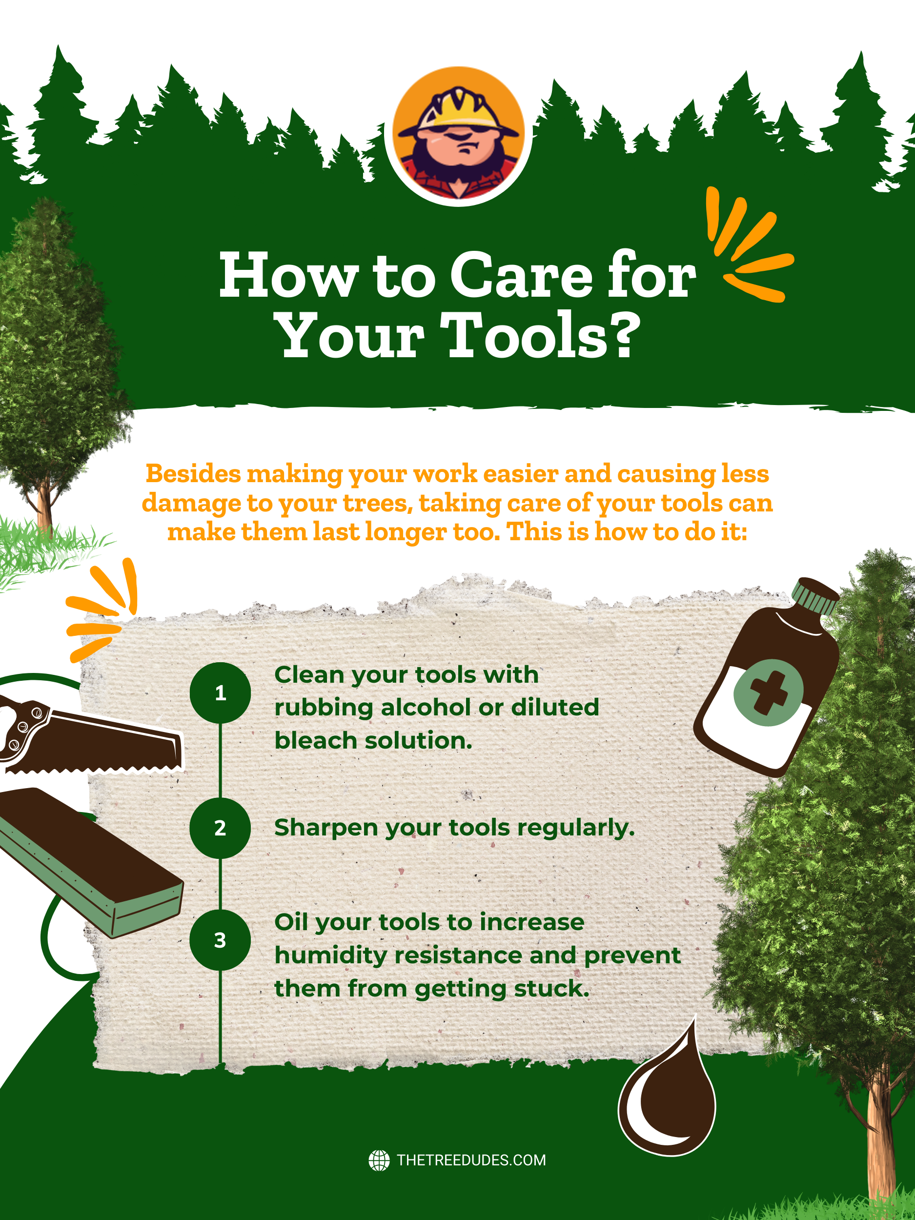 That is why keeping regular care of your tools is crucial. Their condition can significantly influence the pace of your work (damaged devices require more time to handle them properly, or they drastically slow down the process of trimming/pruning), the conditions of the tree, and the overall quality of the work you have done.